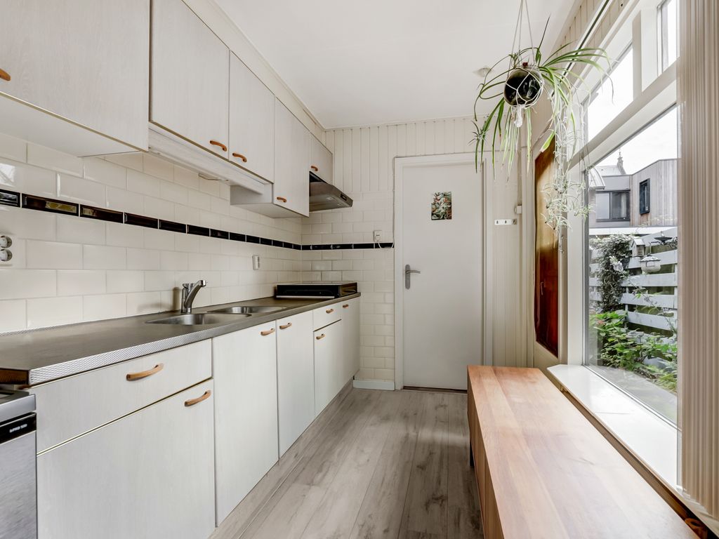 Aan de achterzijde ligt de keuken. Deze is eenvoudig van opzet, maar netjes onderhouden en voorzien van een nieuwe vaatwasser en koelkast (2024) en een inductiekookplaat (met onderliggende gasaansluiting die nog functioneert). Vanuit de keuken is de tuin bereikbaar. Ook vindt u hier het toilet met wastafeltje en raam.