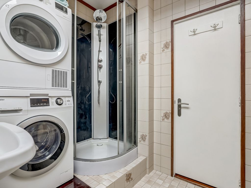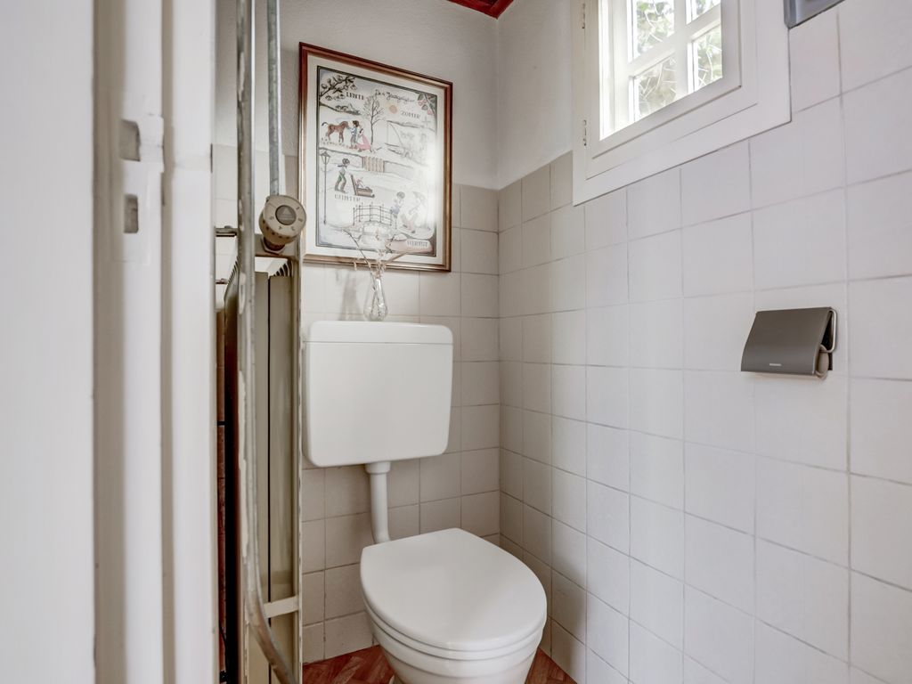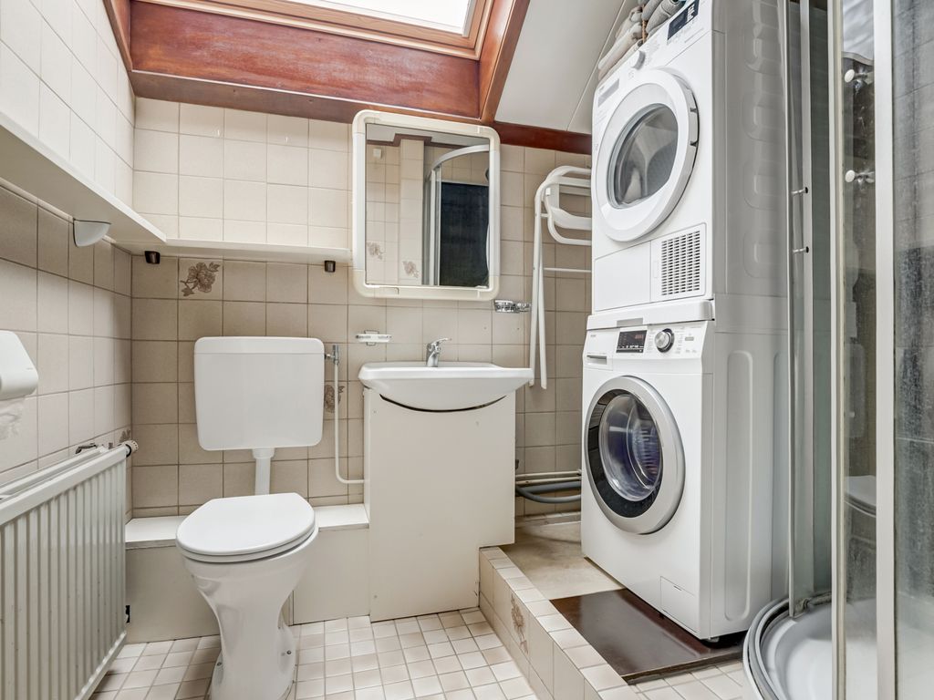 De badkamer is eenvoudig, maar compleet ingericht met een douchecabine, toilet, wastafel en aansluitingen voor wasmachine en droger. Er is een groot Velux-dakraam (houten uitvoering, dubbel glas, geplaatst vóór 2017) dat zorgt voor veel licht en ventilatie.