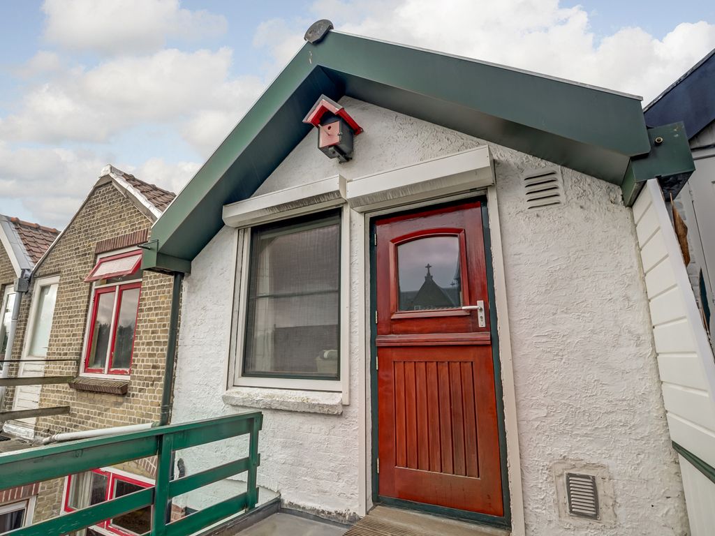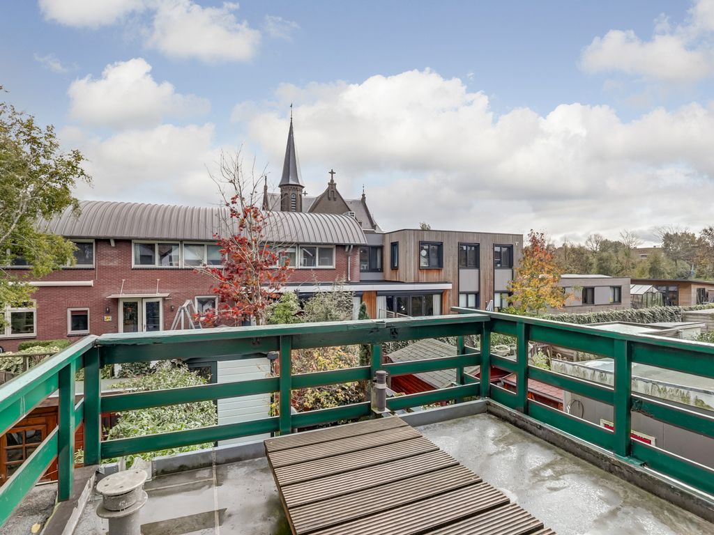 Vanuit de achterkamer is er toegang tot het dakterras, waarvan de balustrade recent is geschilderd en deels vernieuwd. Een heerlijke plek om even buiten te zitten, met uitzicht over de groene binnentuinen van de buurt.