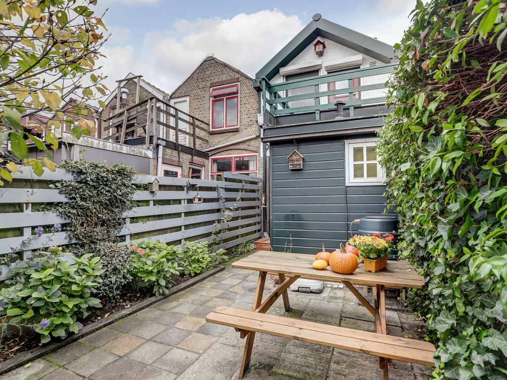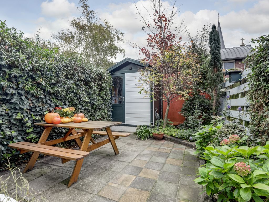 De achtertuin is een ware verrassing: groen, beschut en met veel sfeer. Er is ruimte voor een zitje, plantenbakken en zelfs een droogmolen. De houten schuur (combinatie van hout en kunststof) is voorzien van elektra en biedt volop opbergruimte voor fietsen en tuingereedschap. Delen van de buitenzijde van de woning en schuur zijn recent vernieuwd en geschilderd.