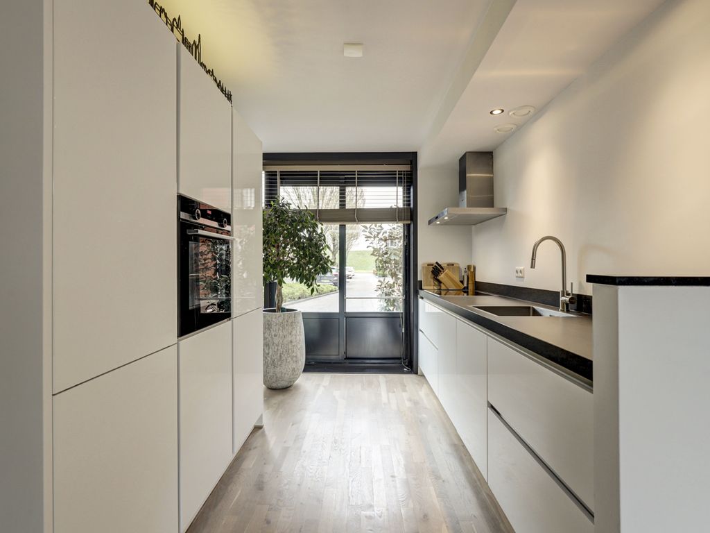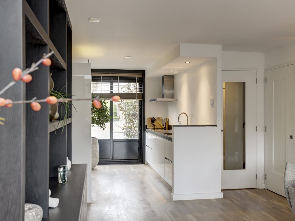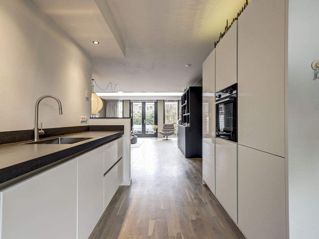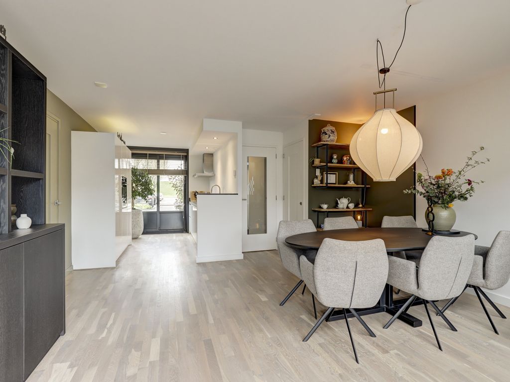 De open keuken aan de voorzijde is modern en strak vormgegeven in hoogglans wit, met een donker werkblad. De keuken is voorzien van diverse inbouwapparatuur zoals inductiekookplaat, afzuigschouw, brede spoelbak, vaatwasser, hetelucht oven, grote koelkast en biedt voldoende werk- en opbergruimte. Het grote raam zorgt hier voor een leuke doorkijk op de straat en extra daglicht. De eetkamer bevindt zich centraal in de woning en vormt een gezellige verbinding tussen keuken en woonkamer, met ruimte voor een royale eettafel.