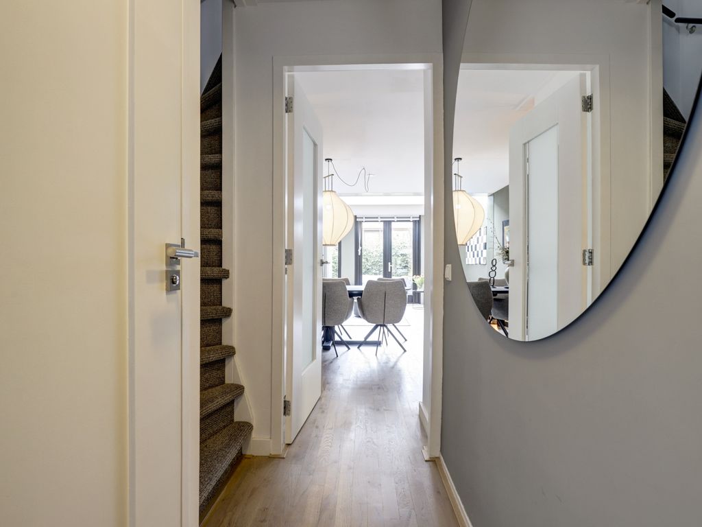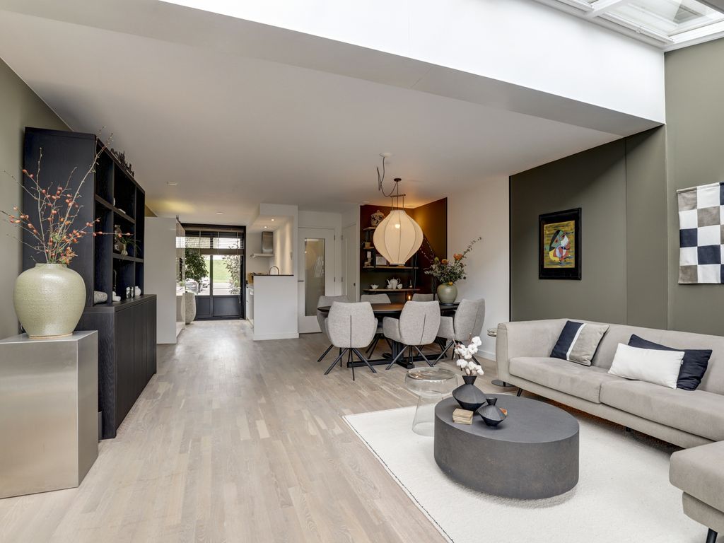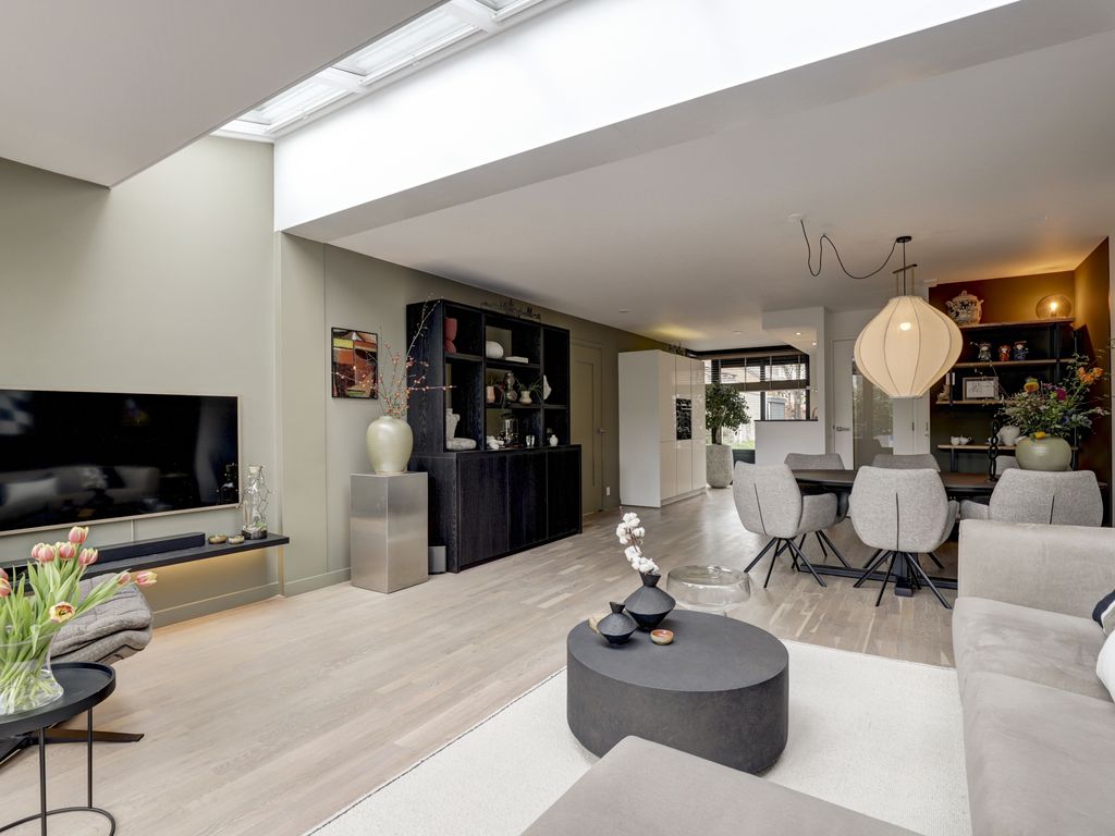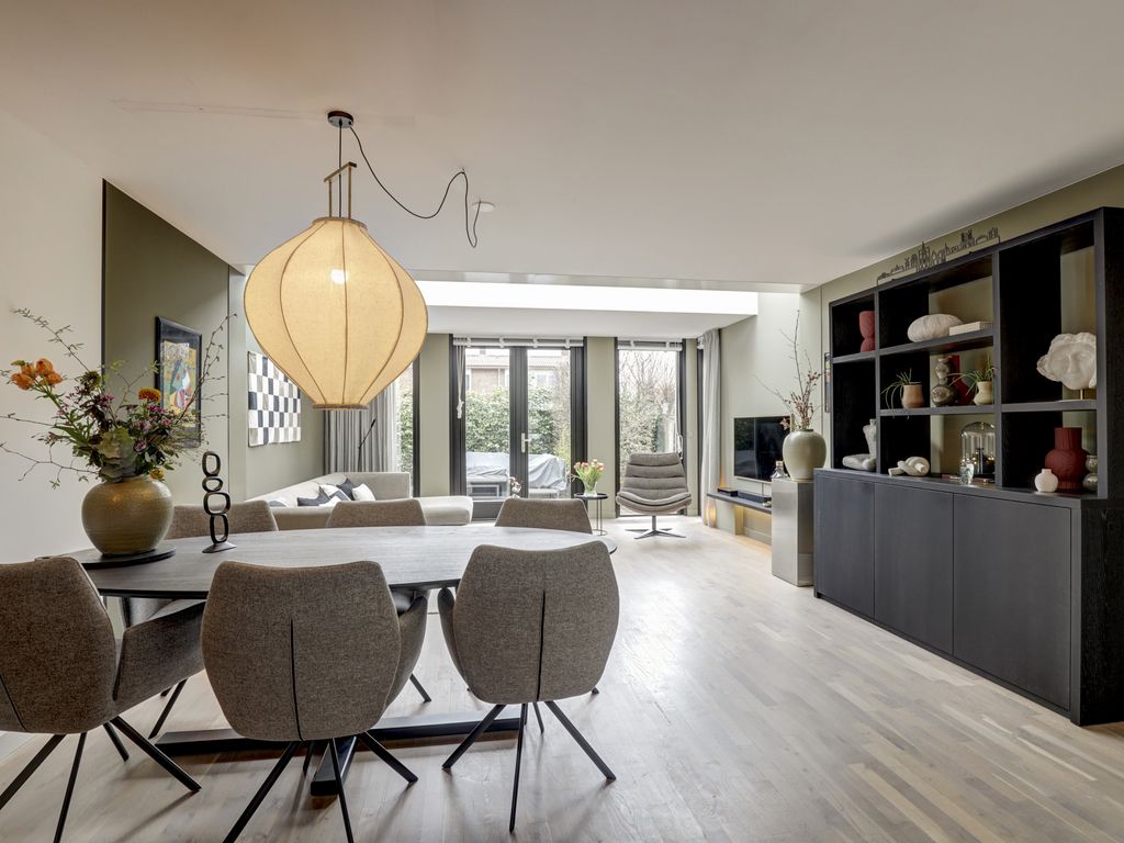 De open keuken aan de voorzijde is modern en strak vormgegeven in hoogglans wit, met een donker werkblad. De keuken is voorzien van diverse inbouwapparatuur zoals inductiekookplaat, afzuigschouw, brede spoelbak, vaatwasser, hetelucht oven, grote koelkast en biedt voldoende werk- en opbergruimte. Het grote raam zorgt hier voor een leuke doorkijk op de straat en extra daglicht. De eetkamer bevindt zich centraal in de woning en vormt een gezellige verbinding tussen keuken en woonkamer, met ruimte voor een royale eettafel.