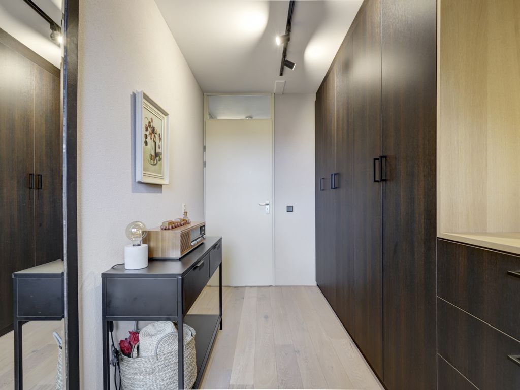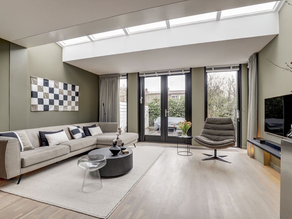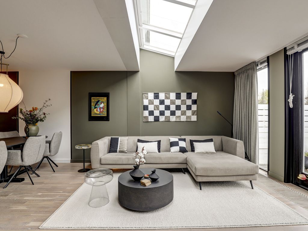 De woonkamer is uitgebouwd en modern afgewerkt. Door de grote lichtstraat in het plafond ontstaat er een aangenaam natuurlijke lichtinval. De wanden zijn goed afgewerkt in rustige tinten, gecombineerd met een warme houten parketvloer die doorloopt over de gehele verdieping. De zithoek is gesitueerd aan de achterzijde en biedt uitzicht op de tuin.