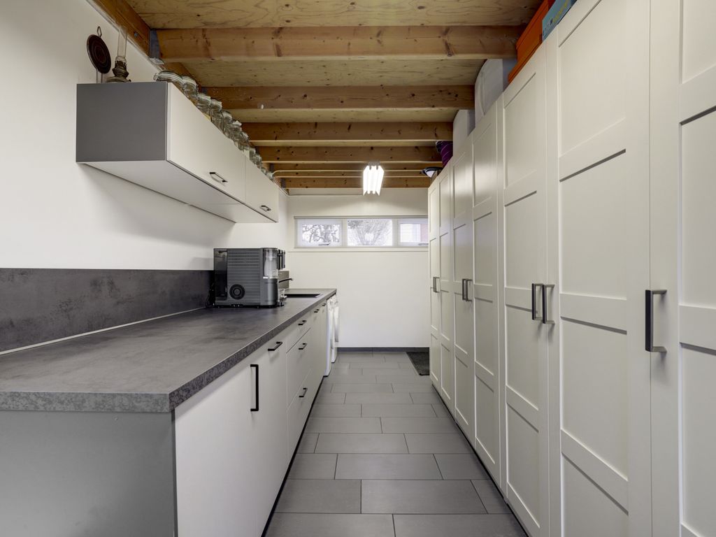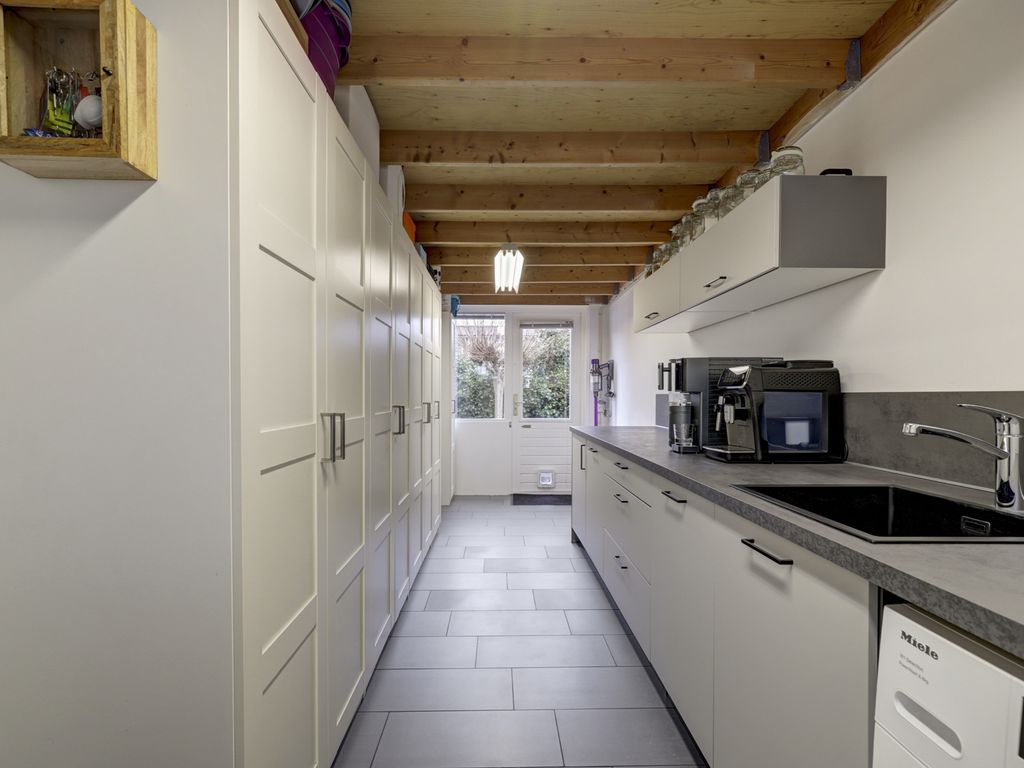 Vanuit de woonkamer (circa 37m²) is er toegang tot voormalige garage welke is geïsoleerd en omgevormd is tot een mooie bijkeuken annex berg-hobbyruimte (circa 16m²) voorzien van geïsoleerde muren en dak, radiator en tegelvloer. Er is een keukenblok (2020) geplaatst met diepvriezer, aansluiting wasapparatuur, koud en warm water (boiler).