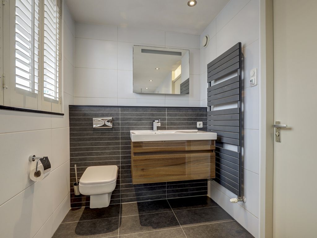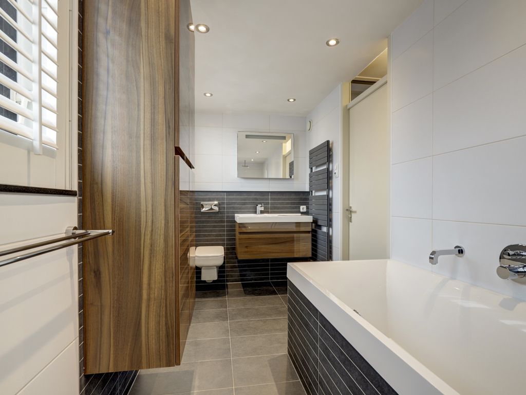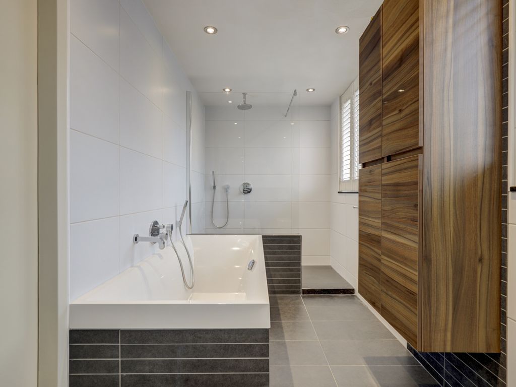 De moderne en royale badkamer van circa 8,5m² (2009) is strak afgewerkt met een combinatie van witte wandtegels en donkere vloertegels met vloerverwarming. De ruimte is voorzien van een ligbad, een grote inloopdouche met regen- en handdouche, een wastafelmeubel met houtaccenten, een radiator en een toilet. Tevens is er een raam aanwezig voor natuurlijke ventilatie en daglicht.