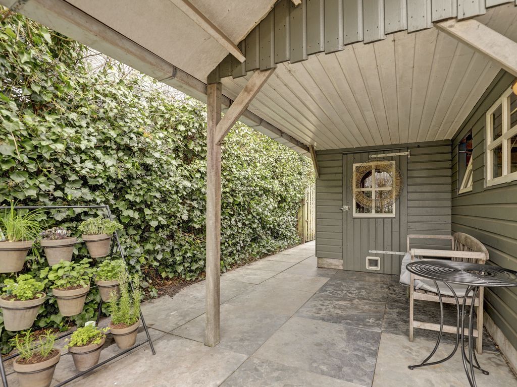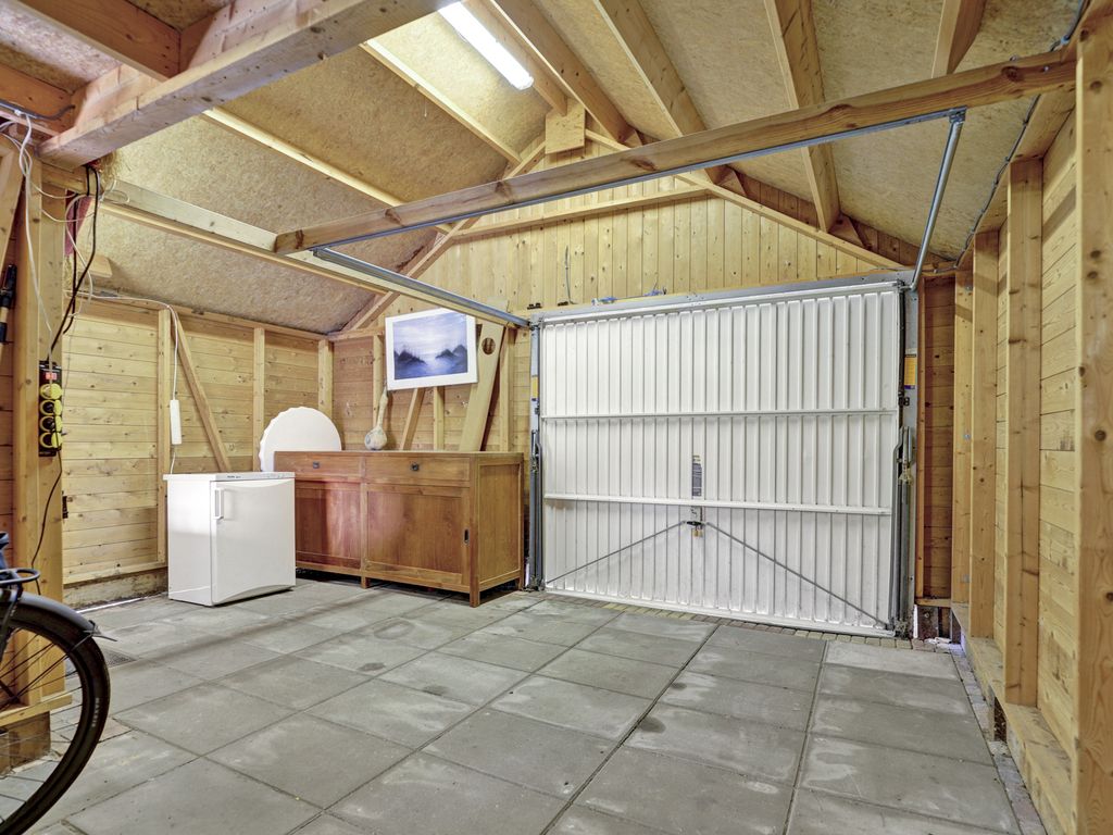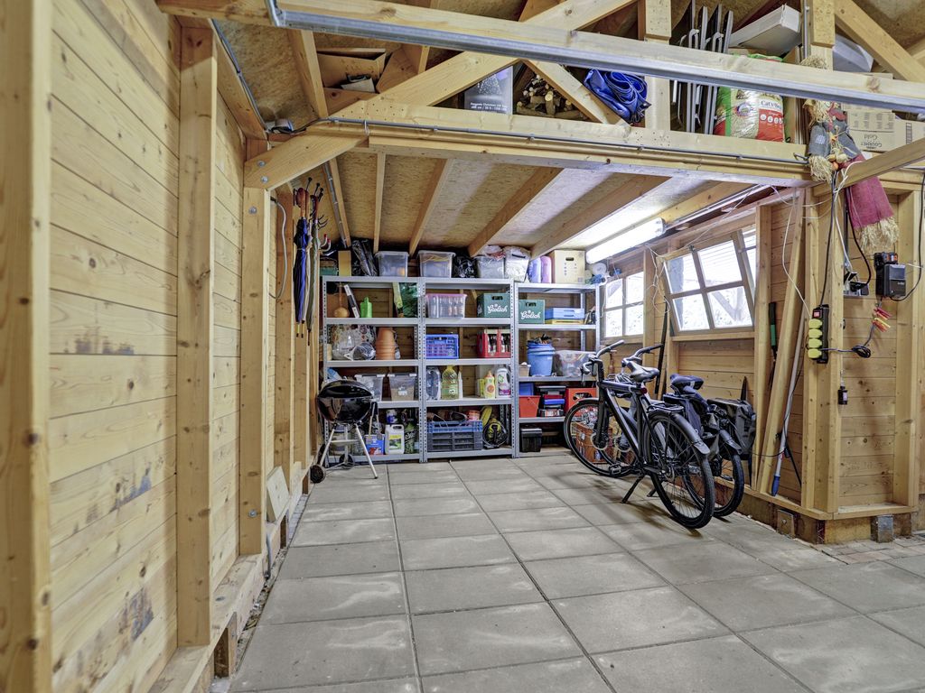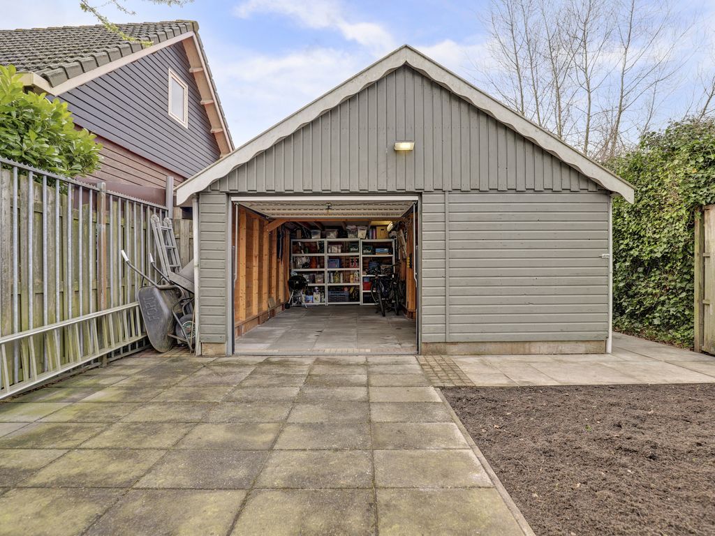 Op het direct aangrenzende perceel waarin de tuin overloopt bevindt zich een ruime vrijstaande houten garage, voorzien van elektra, ideaal voor opslag, fietsen of hobbyruimte. Deze garage is voorzien van een kanteldeur, electra en een deur aan de tuinzijde en een vliering.