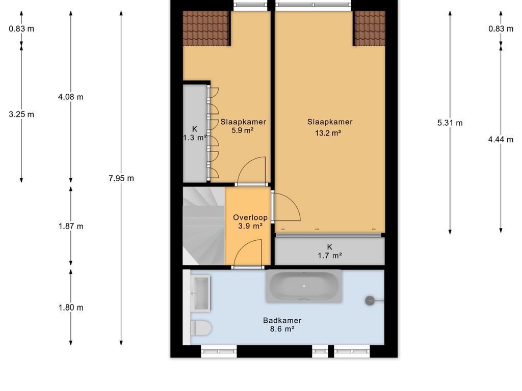 Op de eerste verdieping bevinden zich twee ruime slaapkamers en de badkamer. De hoofdslaapkamer (circa 13m²) aan de achterzijde is royaal en praktisch in te delen en voorzien van een vaste kast. De tweede slaapkamer (circa 6m²) aan de achterzijde is eveneens van goed formaat en voorzien van een vaste kastenwand.
