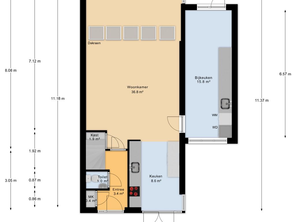 Bijkeuken ca 2.37x6.57m.