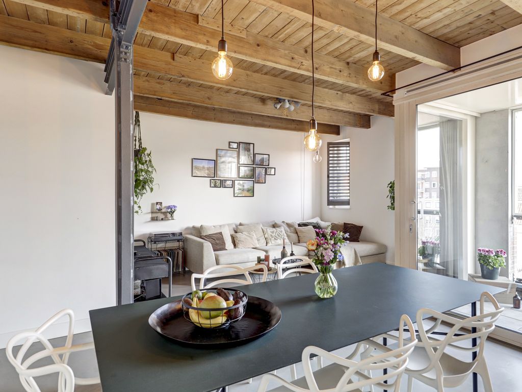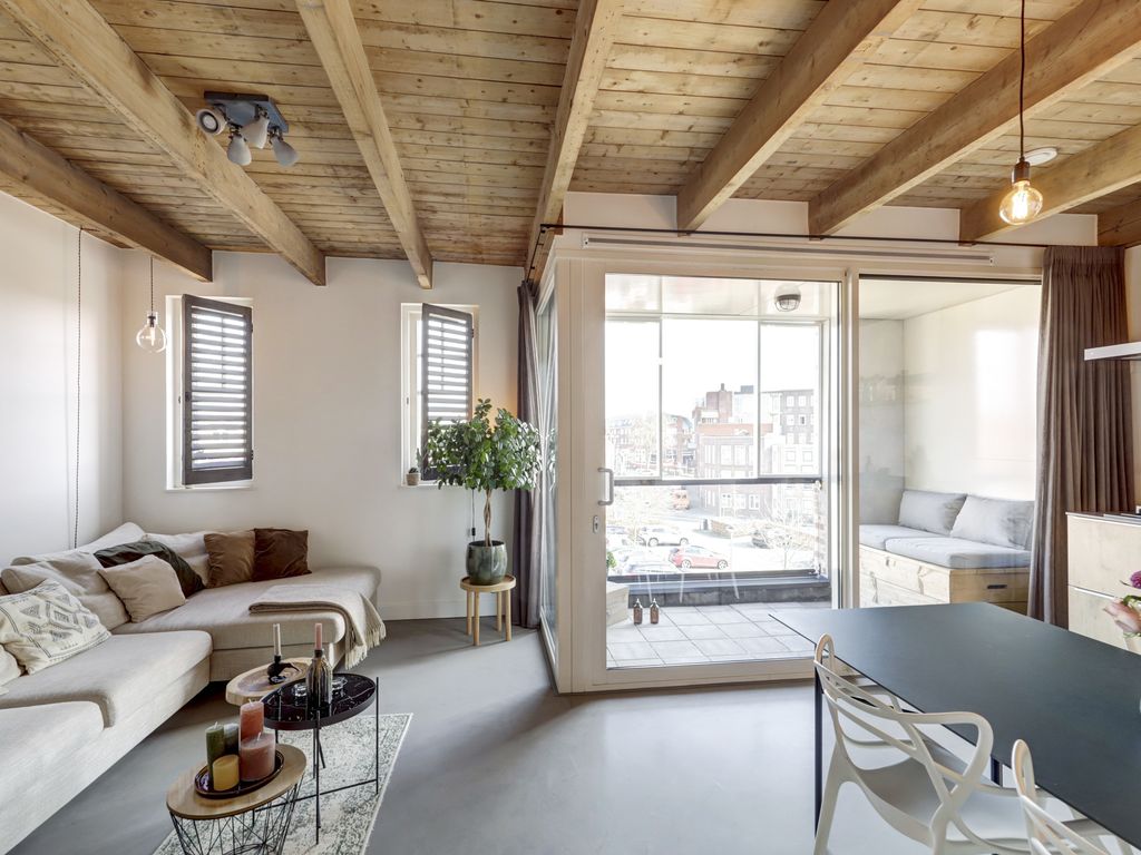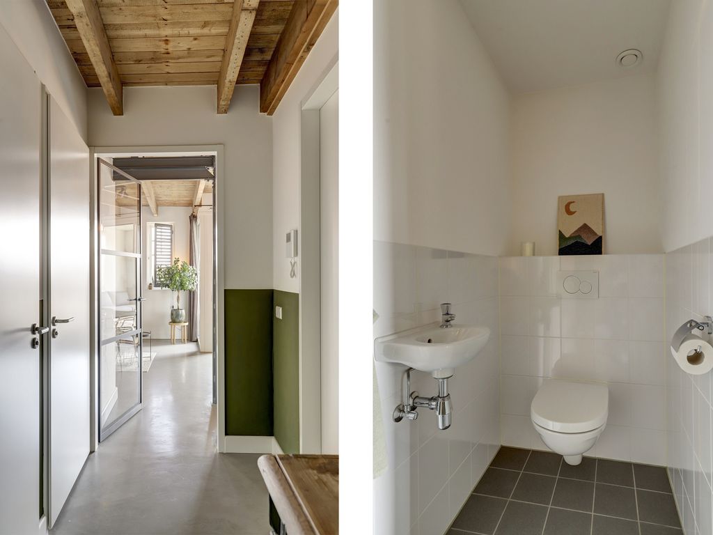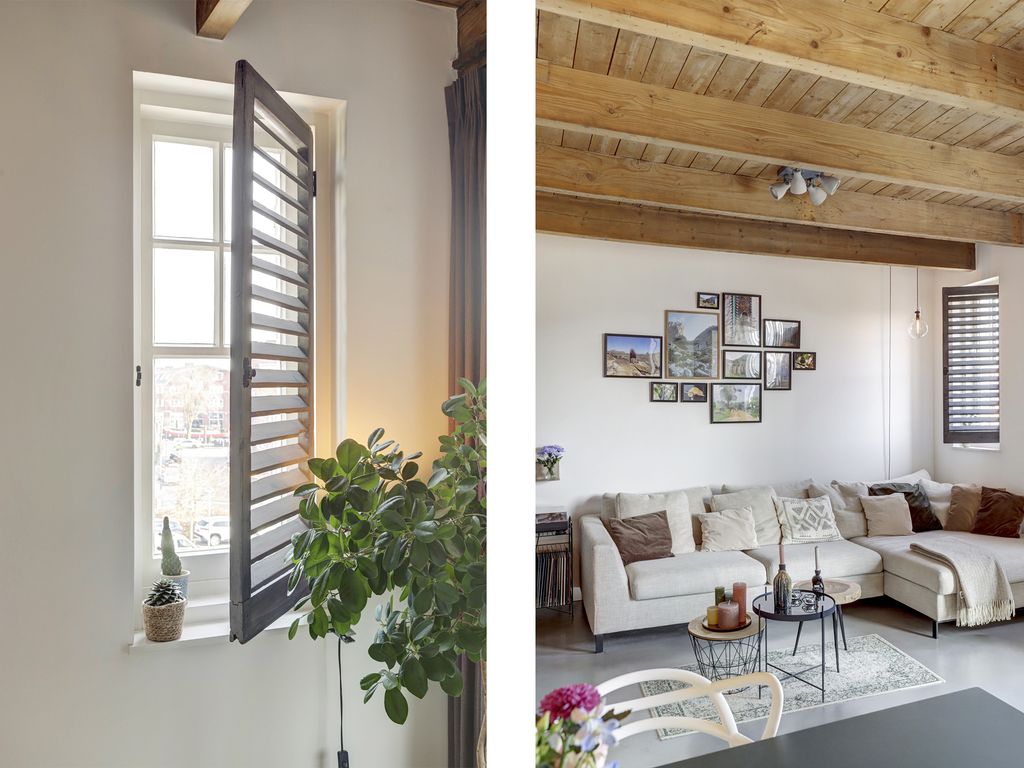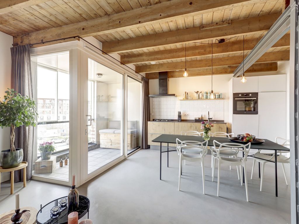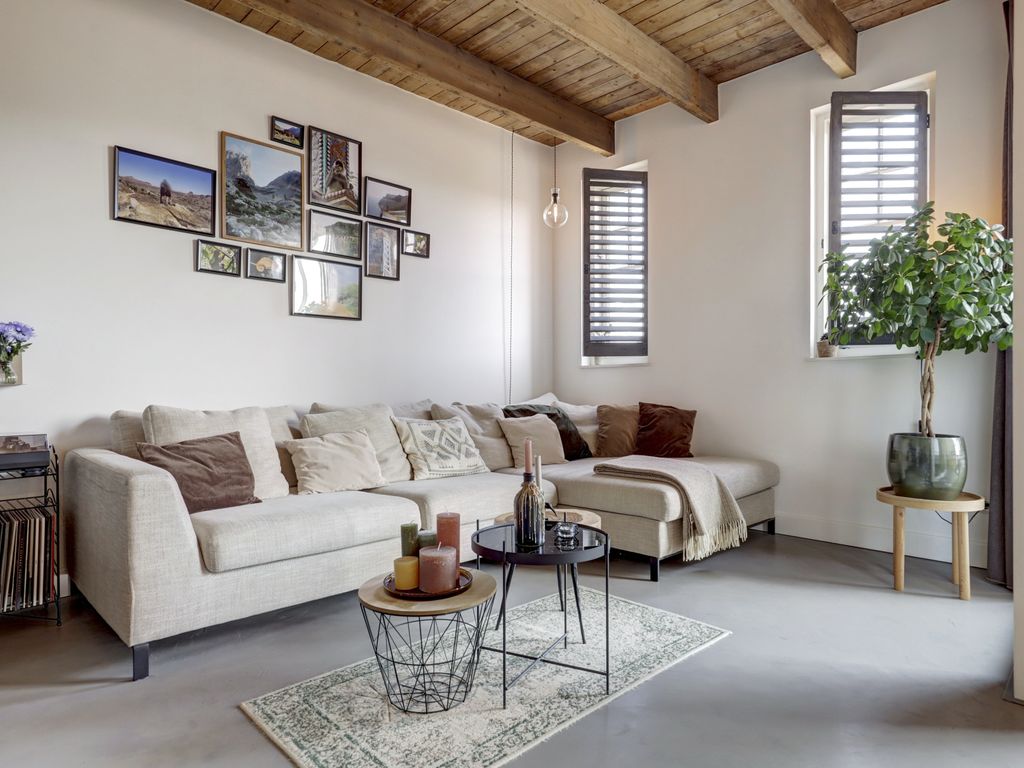 De gehele woning is voorzien van een strakke Forbo Beton Design smeervloer en een prachtig houten balkenplafond, wat zorgt voor een unieke en sfeervolle uitstraling.