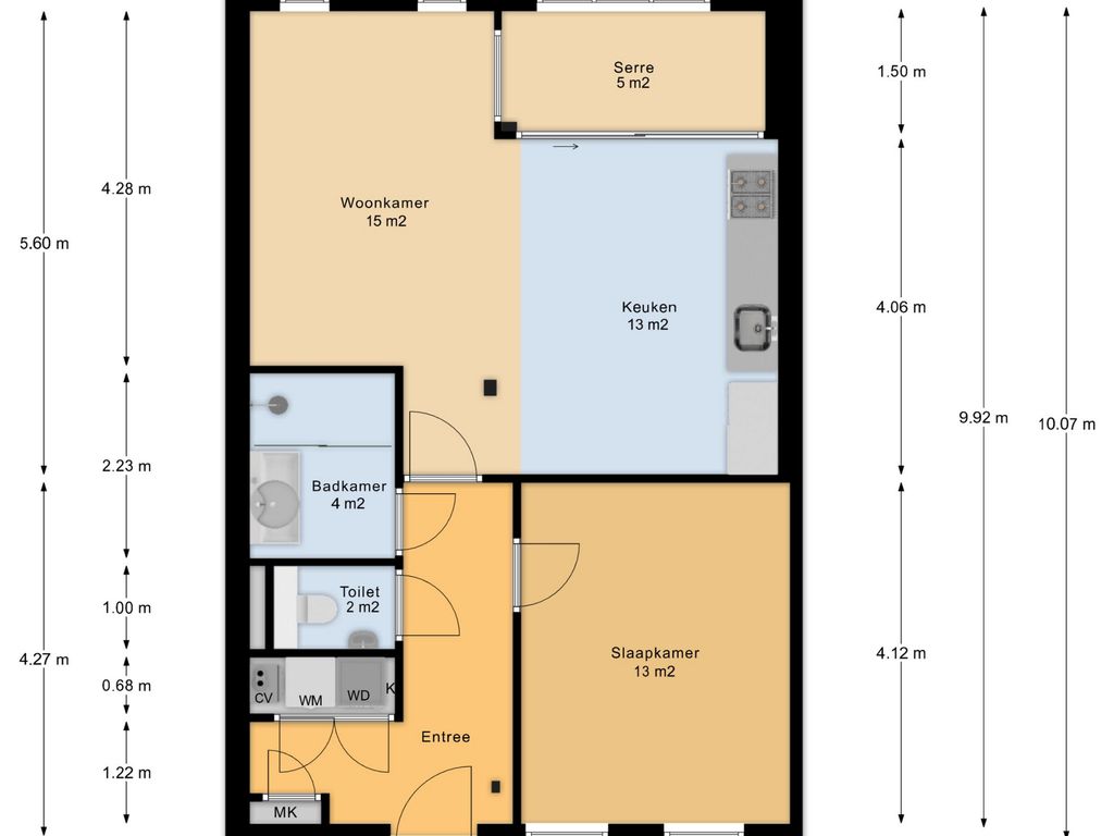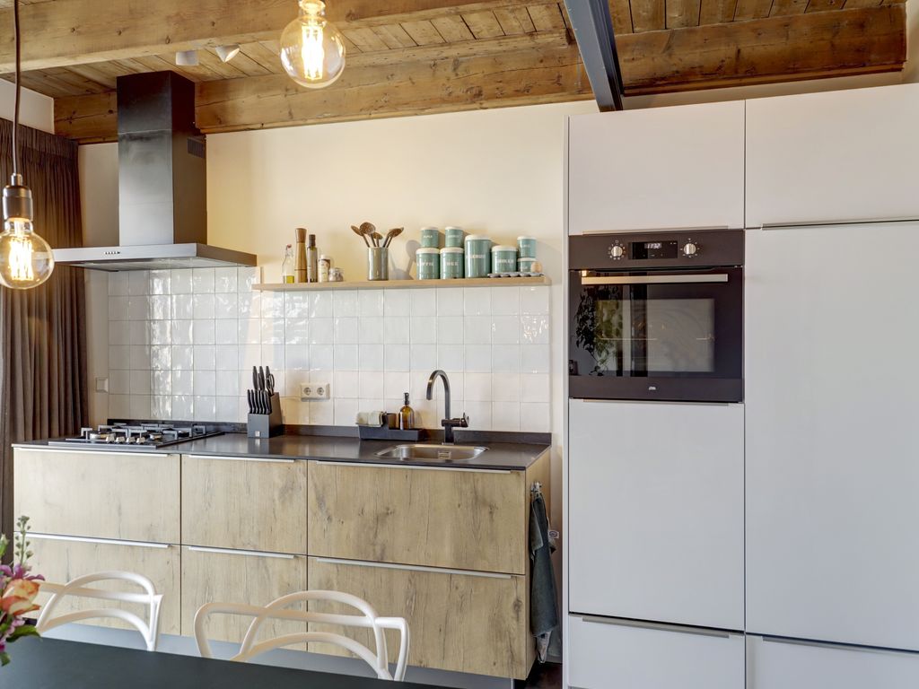 De woonkamer van ca. 15m² is heerlijk licht en vormt samen met de open keuken van ca. 13m² een fijne leefruimte. De moderne keuken is uitgerust met diverse inbouwapparatuur, waaronder een gaskookplaat, afzuigkap, verhoogde vaatwasser, heteluchtoven en een koelkast met vriesvak.