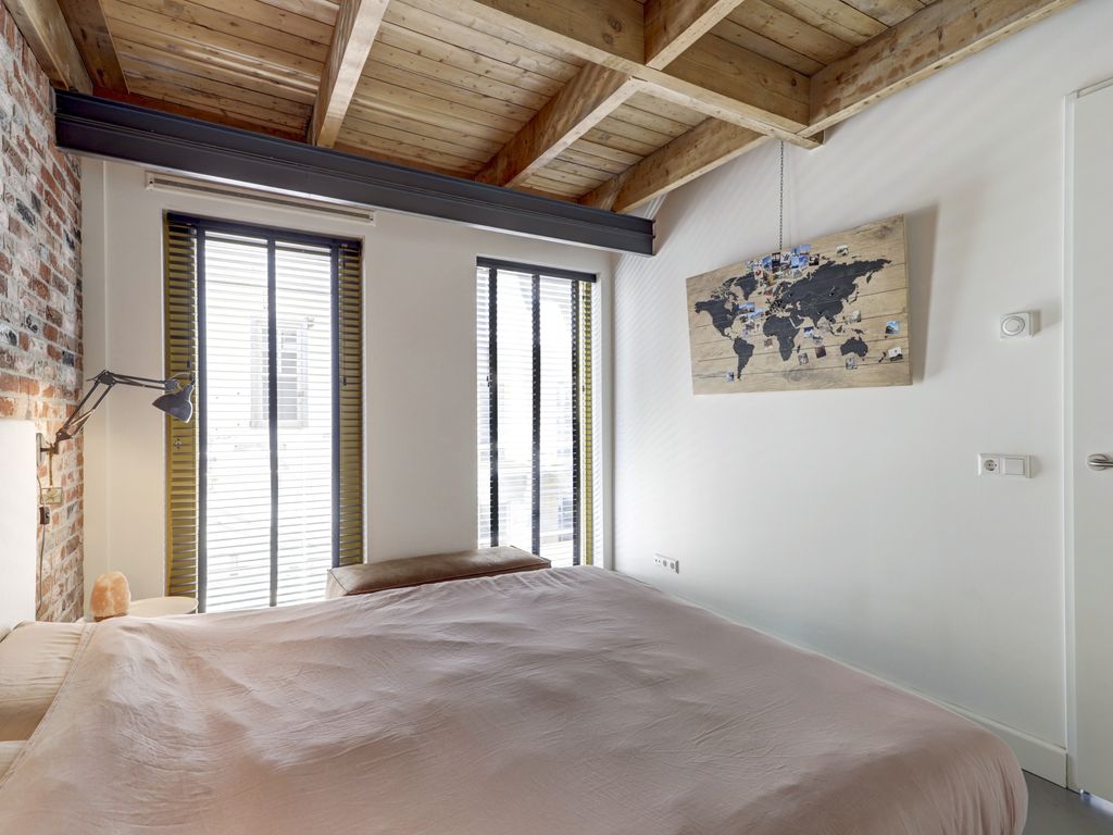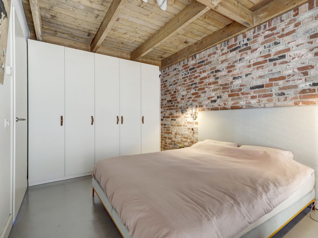 De slaapkamer van ca. 13m² is ruim opgezet en heeft een karaktervolle uitstraling dankzij de fraaie steenstrip wand.