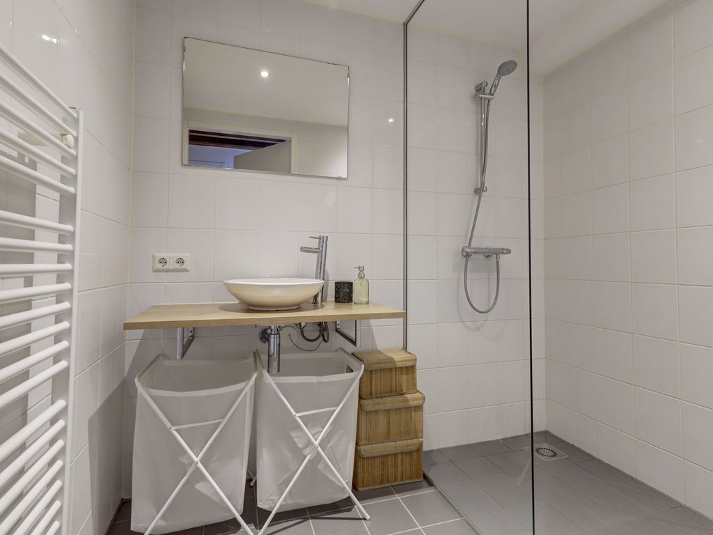 De badkamer van ca. 4m² is eveneens licht betegeld en uitgerust met een ruime inloopdouche en een wastafel.