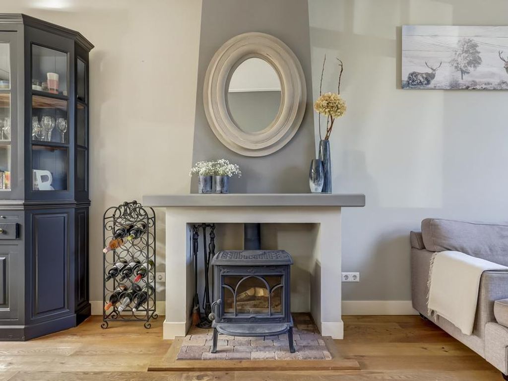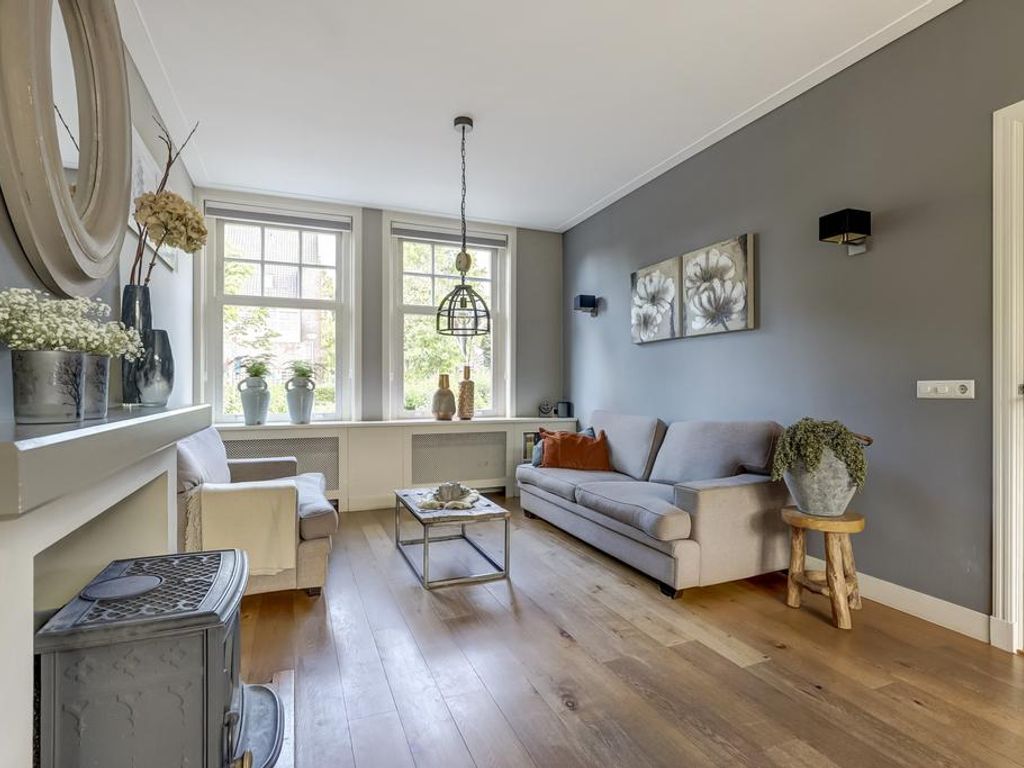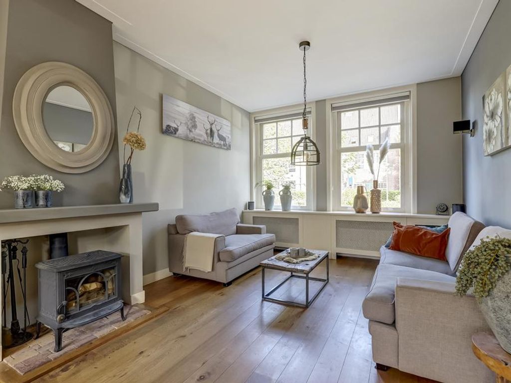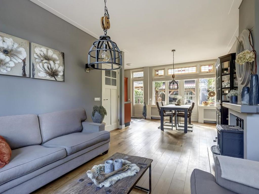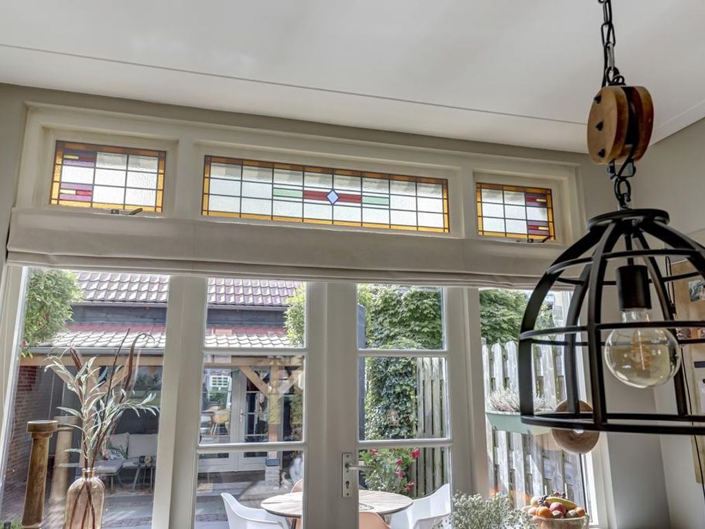 Via de entree betreed je de hal welke is voorzien van een originele Terrazo vloer, waar zich de trapopgang naar de eerste verdieping, de toiletruimte en toegang tot de woonkamer bevinden. De ruime, lichte woonkamer van ca. 25 m² heeft een sfeervolle houtkachel, een prachtige eikenhouten parketvloer en openslaande deuren naar de zonnige achtertuin. De open keuken is uitgerust met moderne inbouwapparatuur, waaronder een Quooker (2023), vaatwasser (2022) en een werkblad van Belgisch hardsteen. Het originele glas-in-lood raam, geïntegreerd in dubbel glas, geeft de ruimte een authentieke uitstraling. Daarnaast is de achterzijde van de begane grond voorzien van elektrisch bedienbare markies.
