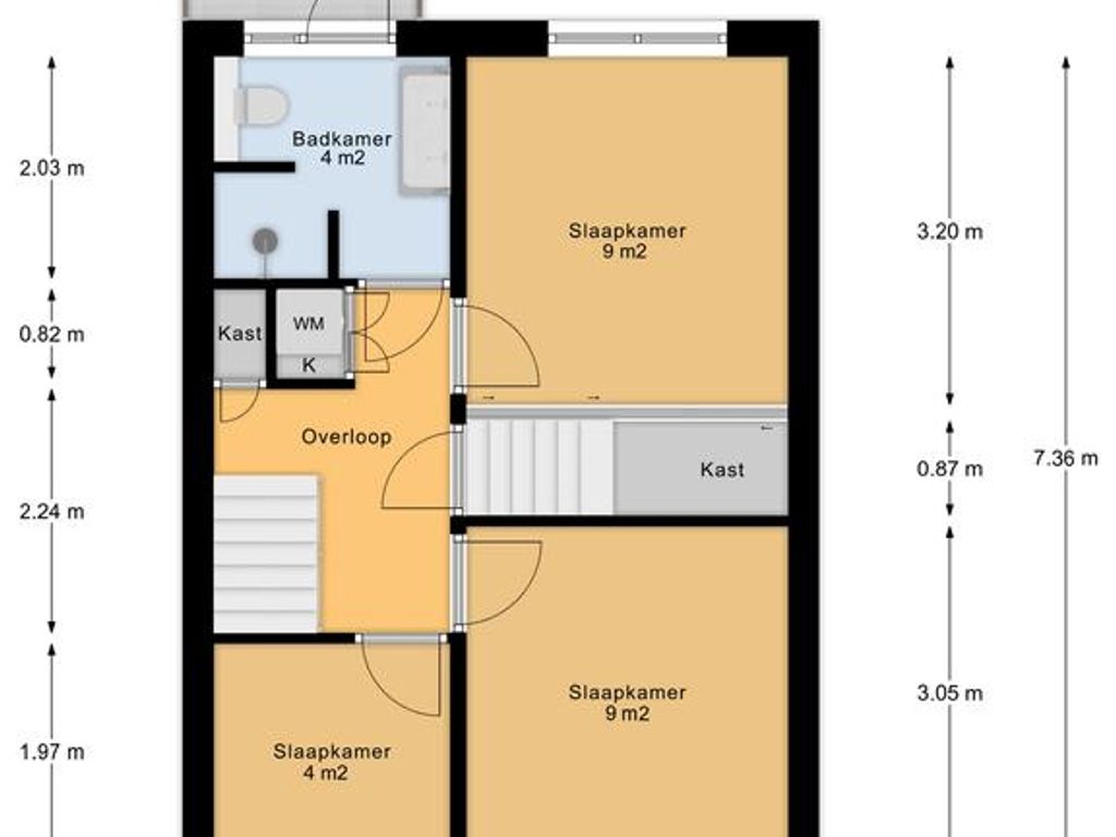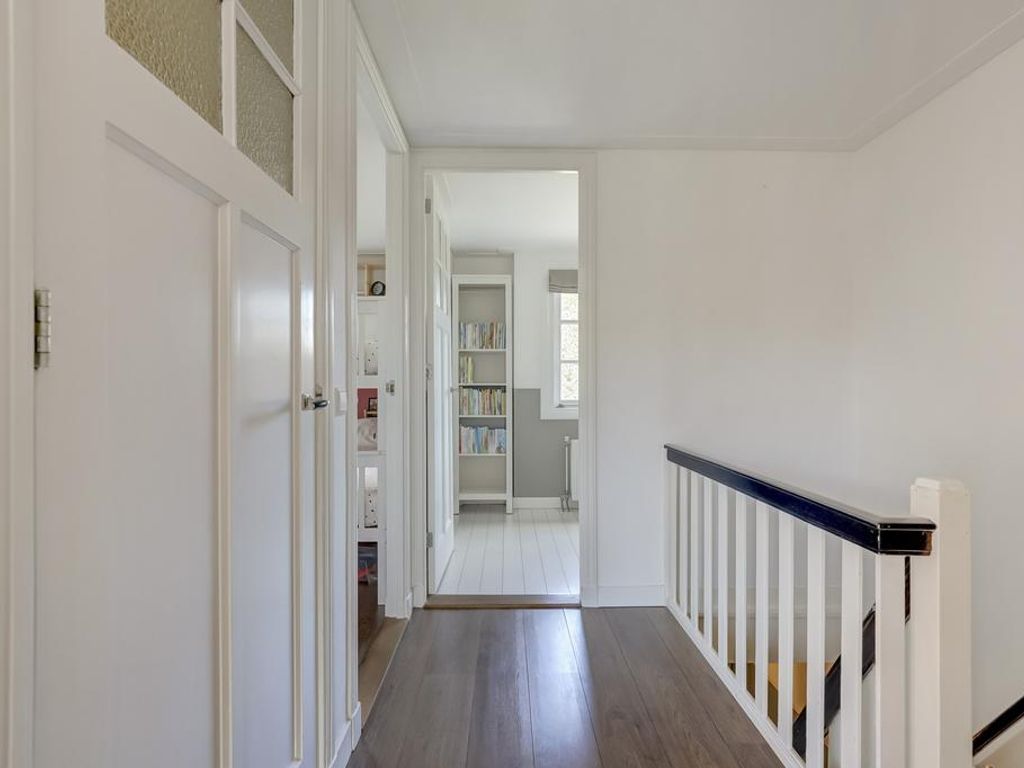 De overloop biedt toegang tot drie slaapkamers en de badkamer. Aan de voorzijde van de woning bevinden zich twee slaapkamers, een kleinere kamer van ca. 4 m² en een ruime kamer van ca. 9 m². Aan de achterzijde bevindt zich nog een slaapkamer van ca. 9 m². De badkamer van ca. 4 m² is voorzien van een douche, een toilet, een dubbele wastafel en geeft toegang tot het balkon.