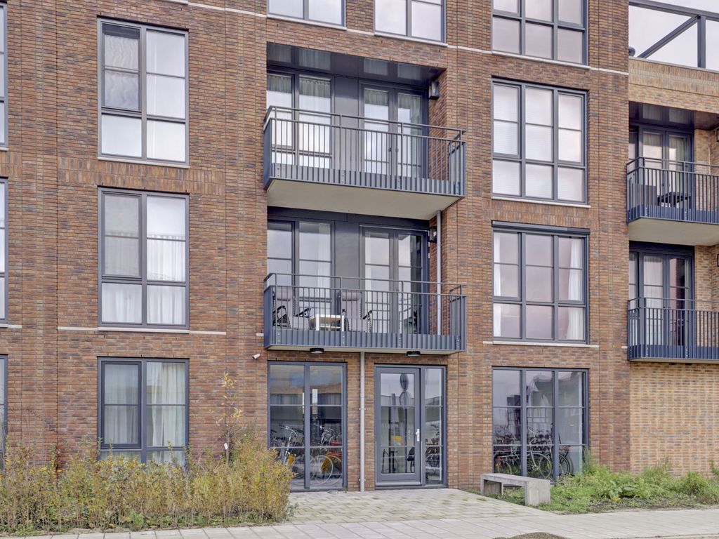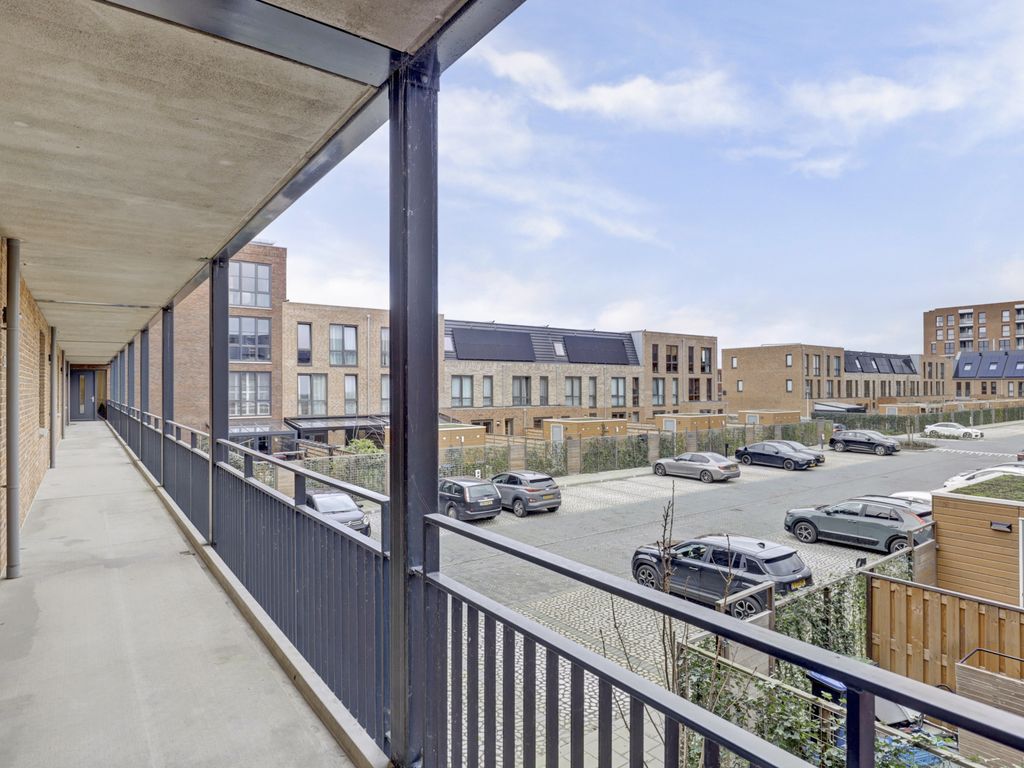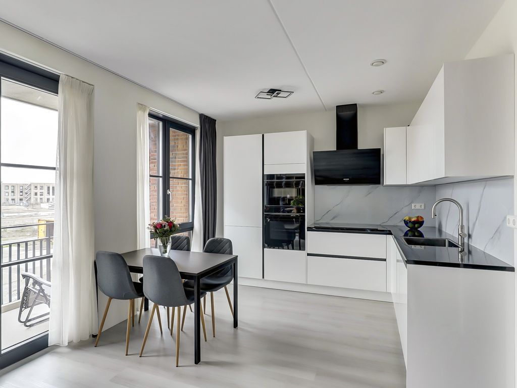 Via de galerij op de eerste verdieping wordt de woning betreden. De entree geeft toegang tot een hal die fungeert als centraal punt van het appartement. Vanuit hier zijn alle vertrekken bereikbaar. De woonkamer is ruim opgezet en profiteert van grote raampartijen, waardoor er veel daglicht binnenvalt. De lichte vloer en neutrale wandafwerking zorgen voor een rustige, moderne uitstraling en bieden een goede basis voor verschillende interieurstijlen. Er is voldoende ruimte voor zowel een comfortabele zithoek als een eethoek. Een deel van de woonkamer is momenteel ingericht als werkplek, wat de ruimte ook zeer geschikt maakt voor thuiswerken.
