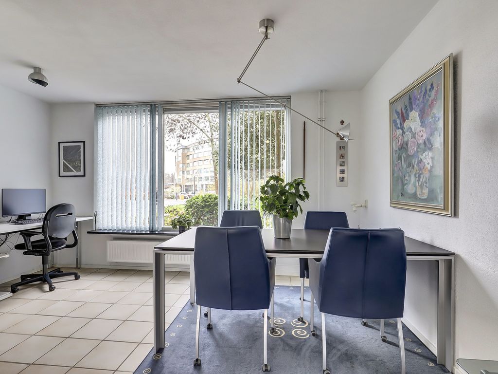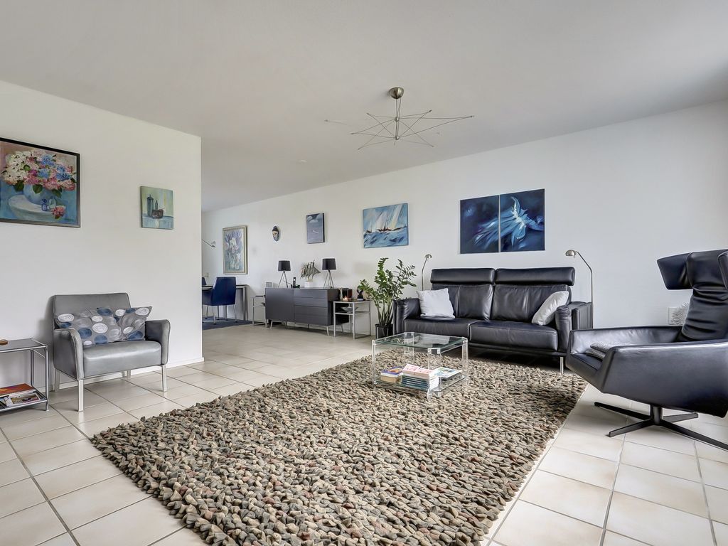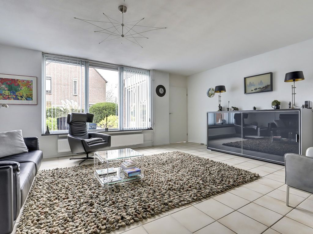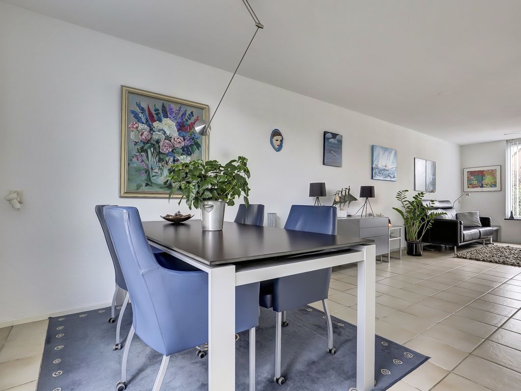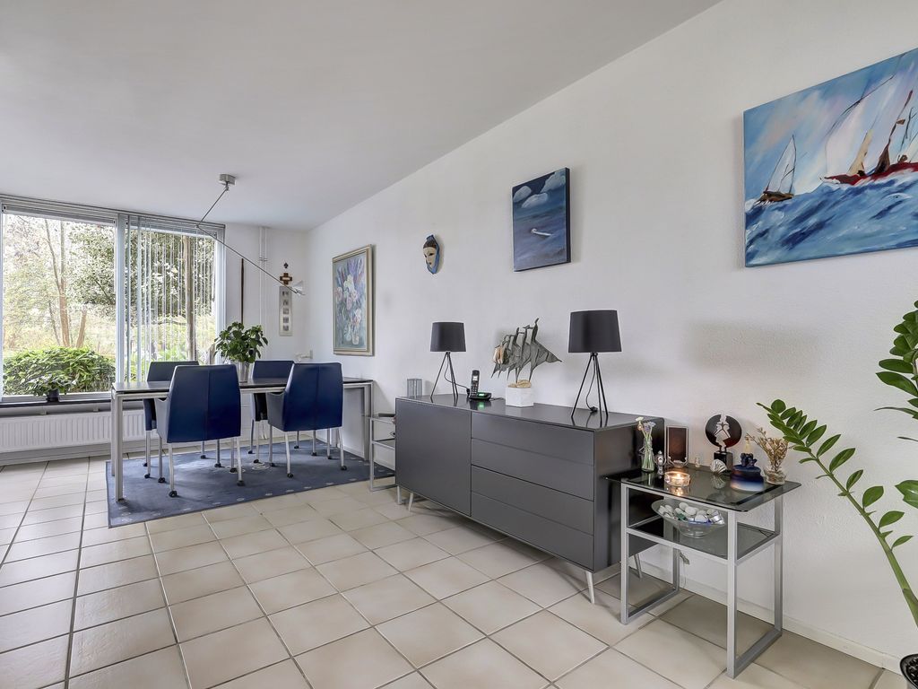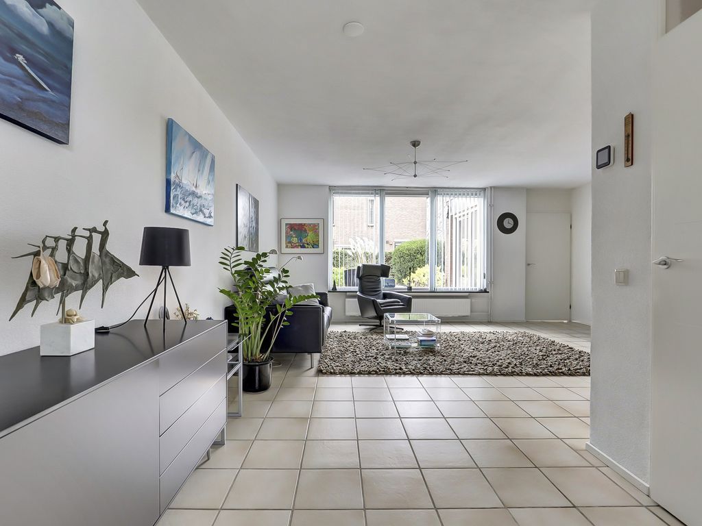 achterzijde zorgen voor veel daglicht. De vloer is voorzien van lichte plavuizen, wat de ruimte een rustige,