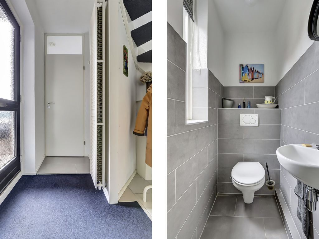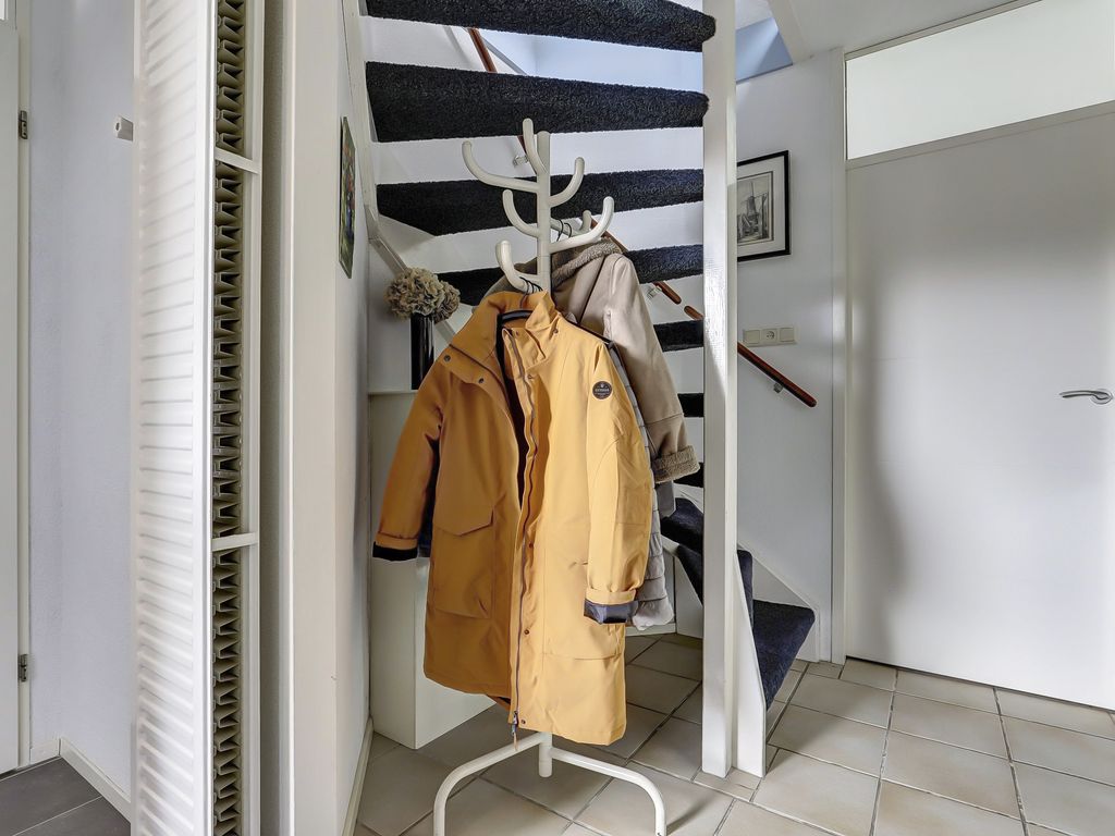 de ruime hal bevinden zich de meterkast, de garderoberuimte, het moderne toilet met fonteintje en de trap