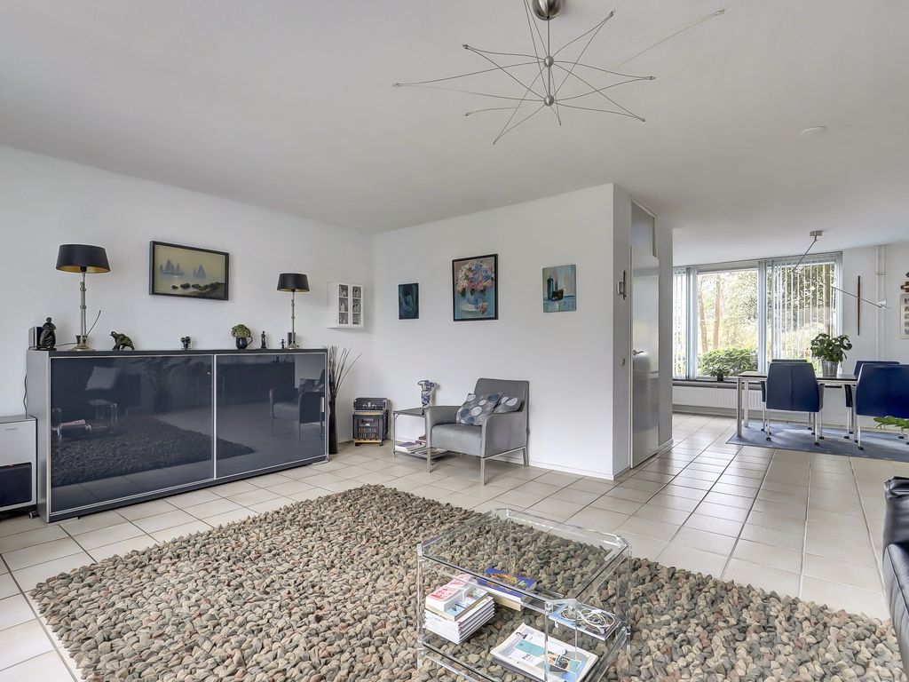 De woonkamer beslaat de volledige lengte van het huis. Grote raampartijen aan zowel de voor- als