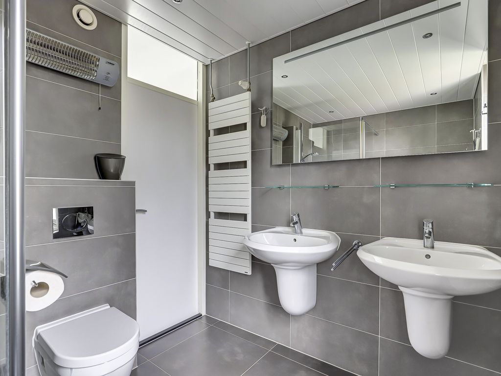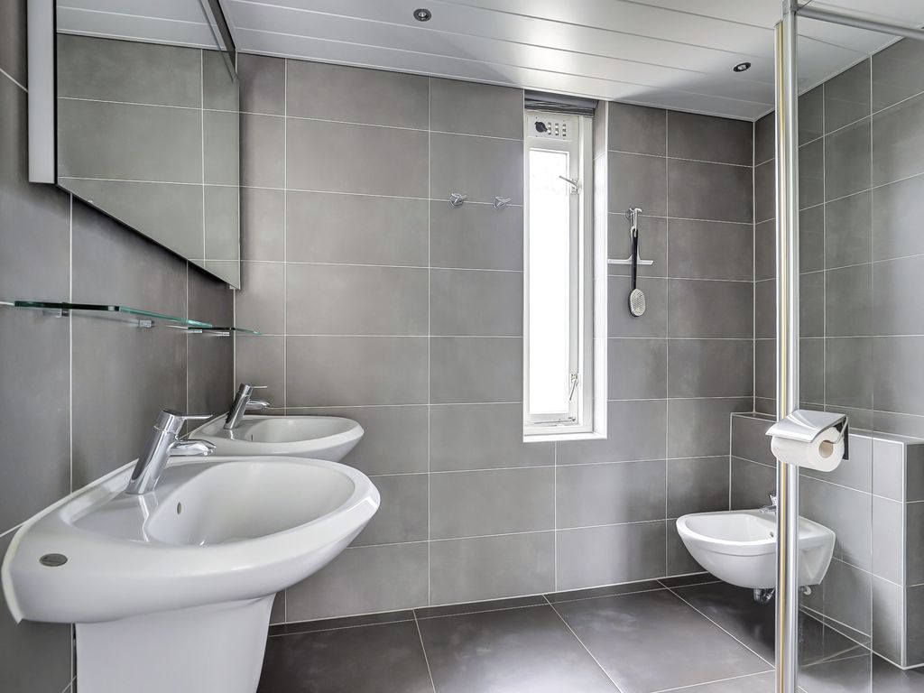 met glazen wand, zwevend toilet, bidet, twee wastafels met spiegels en een designradiator. De strakke wand- en vloertegels maken het geheel compleet en onderhoudsvriendelijk.