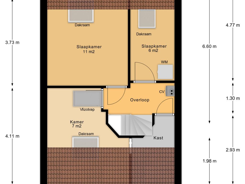 Op de overloop is de cv-installatie gesitueerd. Aan de achterzijde ligt een slaapkamer met dakraam,