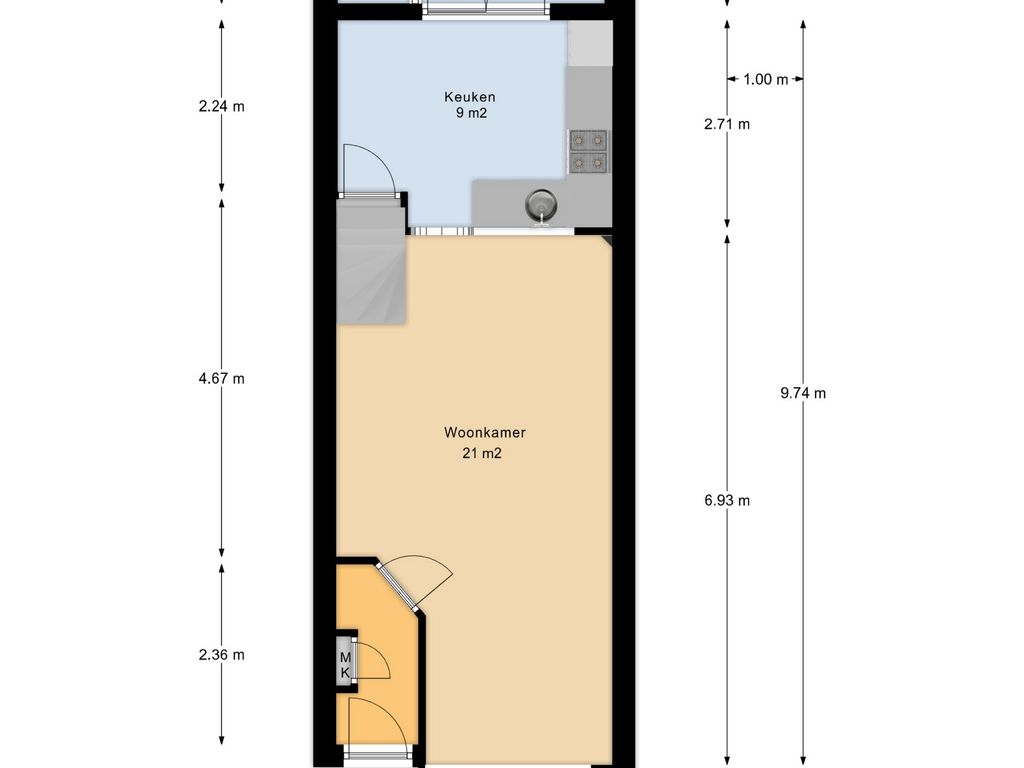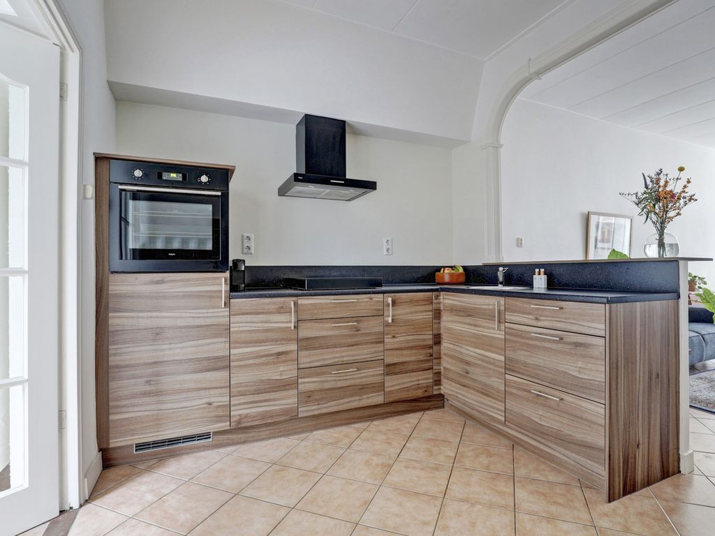 De keuken is uitgevoerd in een houtlook kleurstelling en voorzien van een donker werkblad. De opstelling biedt voldoende kastruimte en is uitgerust met diverse apparatuur, waaronder een oven, kookplaat, afzuigkap en spoelbak. Vanuit de keuken is de bijkeuken bereikbaar, waar zich de witgoedaansluitingen bevinden en extra bergruimte beschikbaar is. Vanuit de bijkeuken is het toilet bereikbaar.