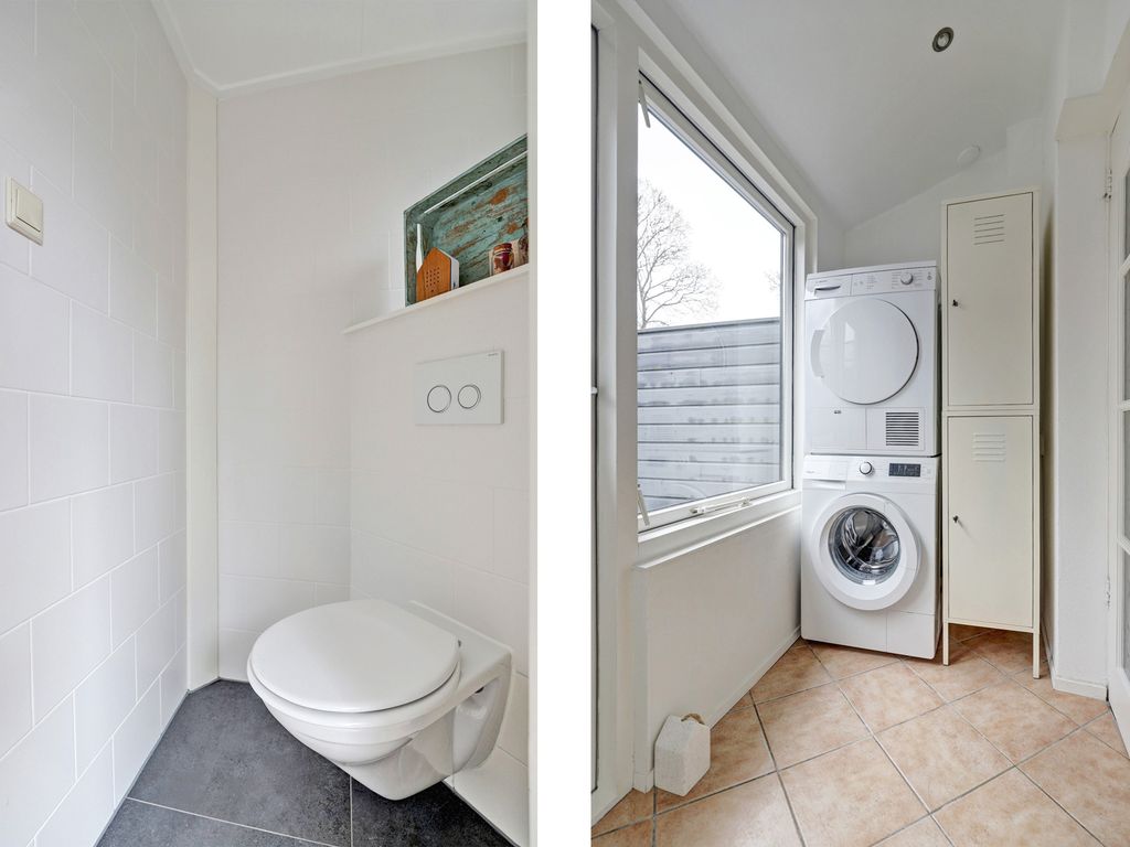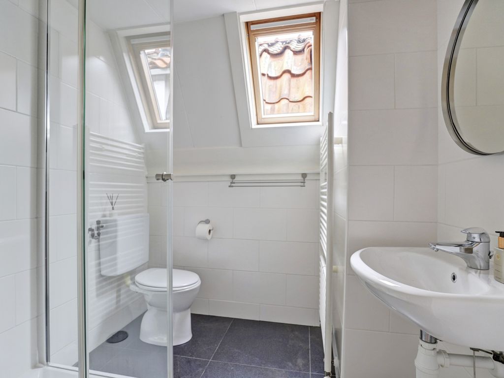 De badkamer is functioneel ingericht en uitgevoerd in een lichte tegelstelling met een donkere vloertegel. U beschikt hier over een douchecabine, toilet en wastafel. Dankzij de aanwezige dakramen beschikt de badkamer over natuurlijke ventilatie en prettig daglicht.