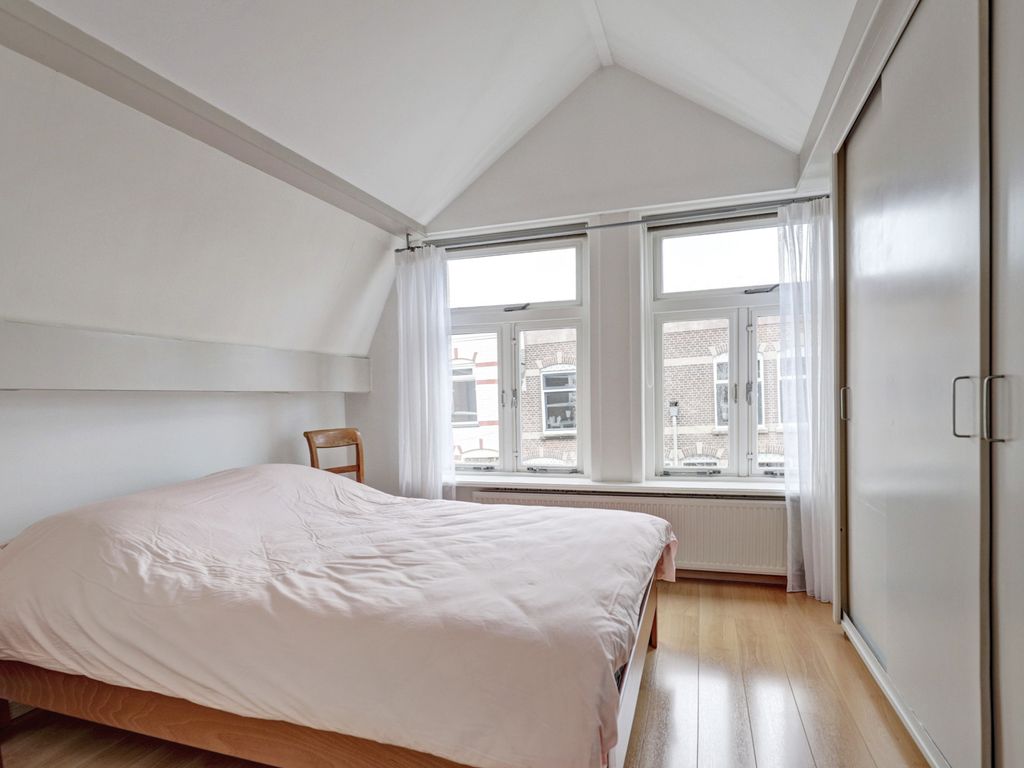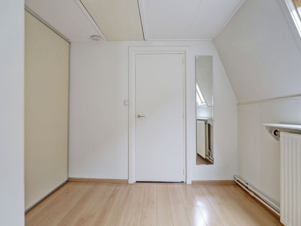Op de eerste verdieping bevinden zich twee slaapkamers en de badkamer. De hoofdslaapkamer is gelegen aan de voorzijde van de woning en is voorzien van een laminaatvloer, lichte wandafwerking en een prettige hoge nok, wat zorgt voor een ruimtelijk en comfortabel gevoel. Grote ramen zorgen hier voor een fijne lichtinval. Daarnaast beschikt deze slaapkamer over praktische kastruimte.