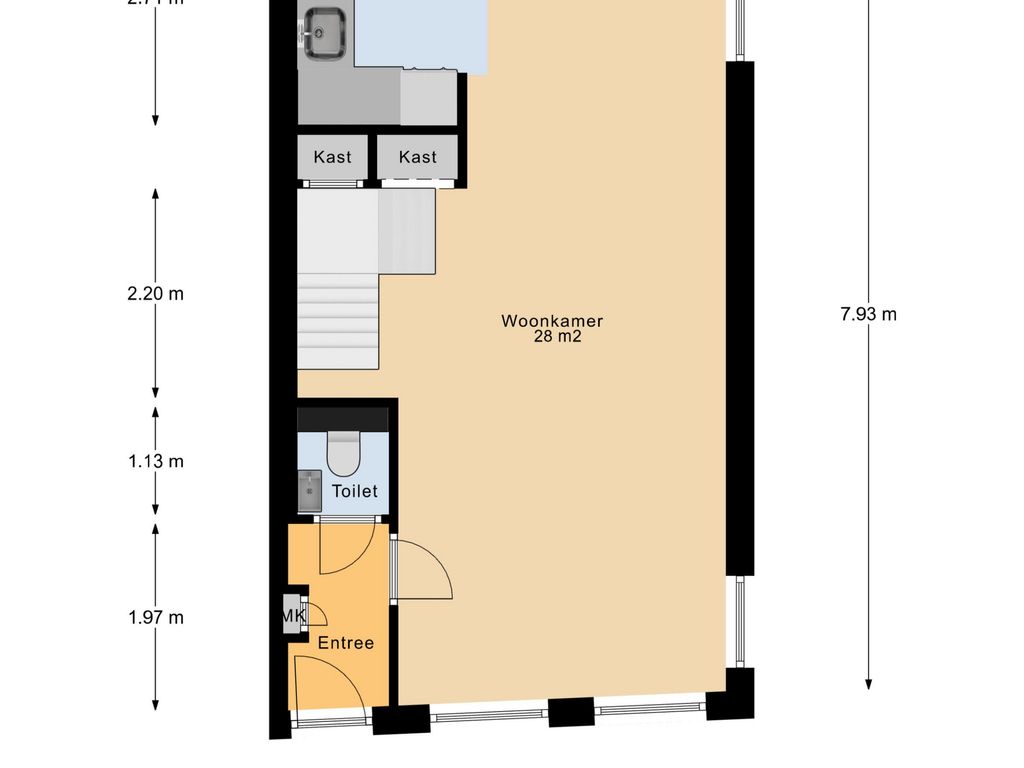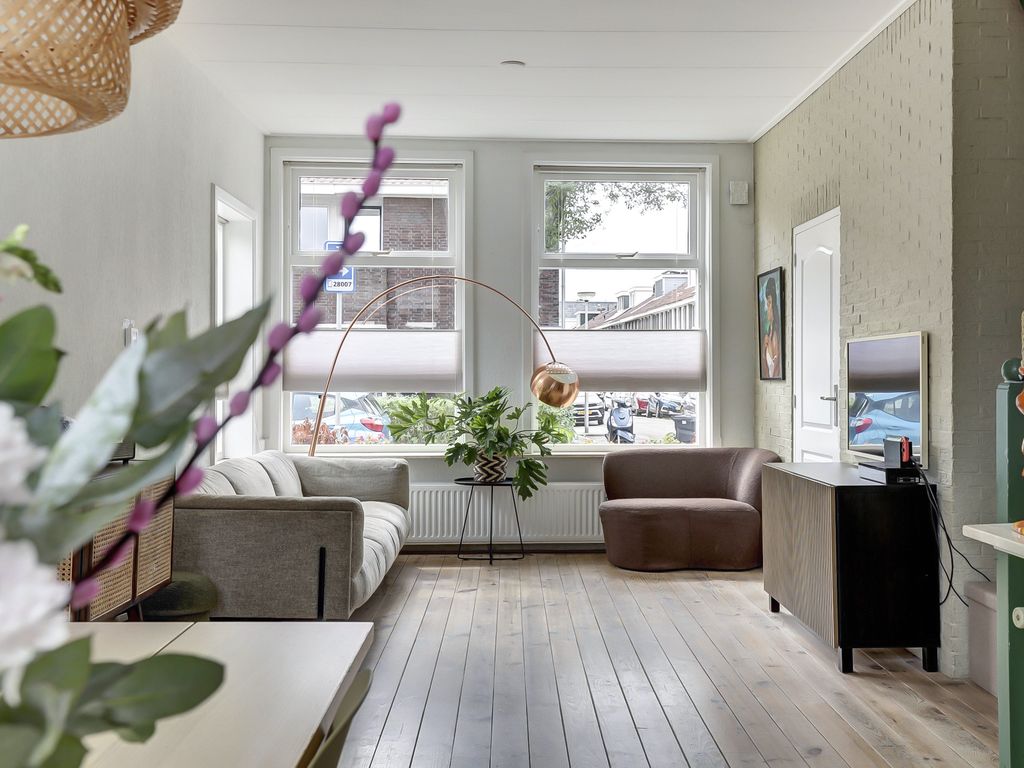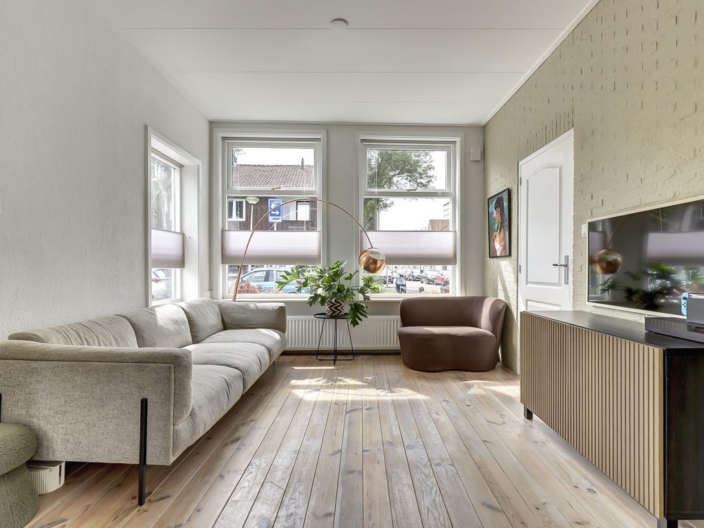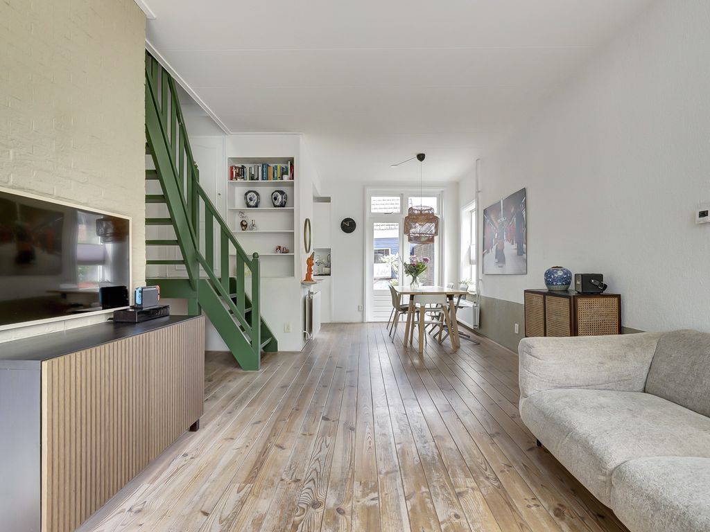 Entree via de voorzijde van de woning. In de hal bevinden zich de meterkast (voorzien een vernieuwede groepenlast met 8 groepen en 2 aardlekschakelaars) en het toilet. De lichte woonkamer van ca. 28 m² is ruim opgezet, voorzien van een houten vloer en grote raampartijen aan zowel de voor-, achter- en zijzijde, wat zorgt voor een prettige lichtinval. De achterzijde van de woonkamer geeft toegang tot de achtertuin via openslaande deuren.