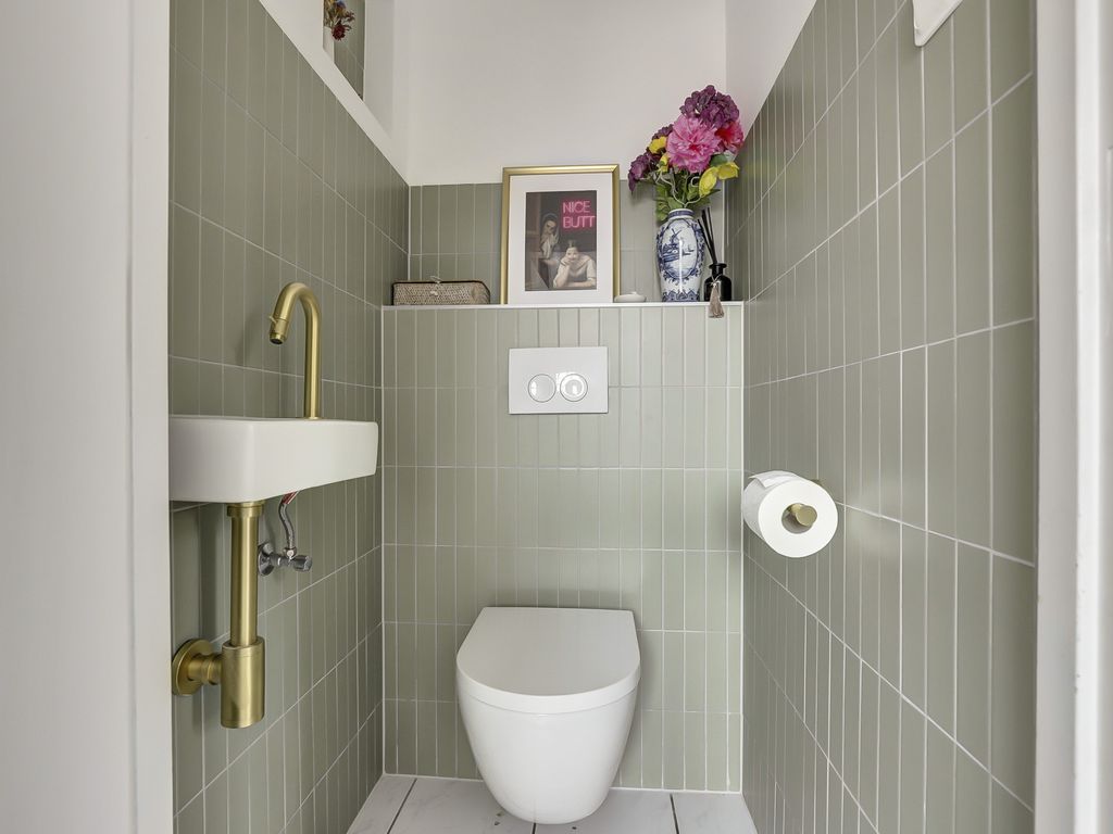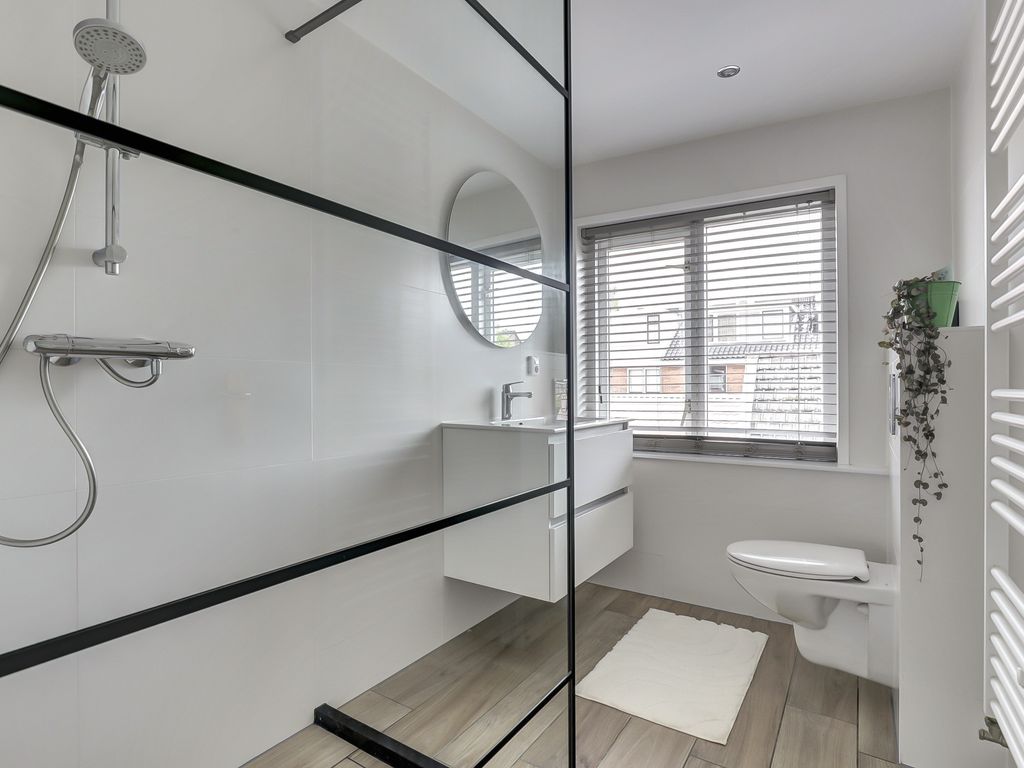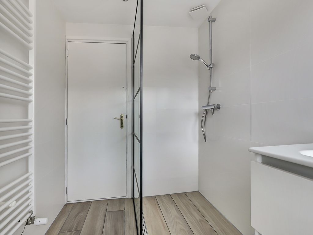 De badkamer (2019) is centraal op de verdieping geplaatst en is modern afgewerkt met een ruime inloopdouche met glazen wand, een hangend toilet, een wastafelmeubel met geïntegreerde LED-verlichting en een design handdoekradiator. De ruimte is volledig betegeld en voorzien van een raam voor natuurlijke ventilatie en daglicht.