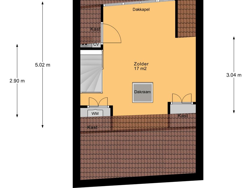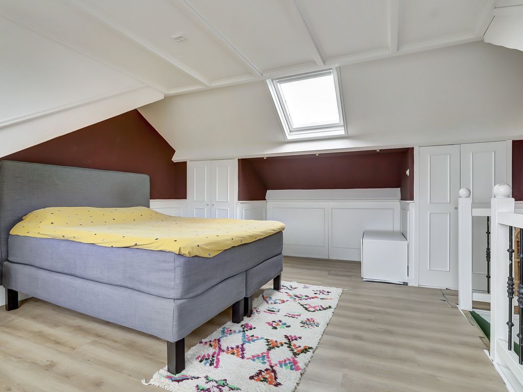 Een vaste trap geeft toegang tot de zolderverdieping, momenteel in gebruik als ruime vierde slaapkamer (ca. 17 m²). Dankzij de dakkapel en het dakraam is het hier aangenaam licht. De ruimte beschikt over meerdere vaste kasten, aansluitingen voor wasmachine en droger. Ook is hier de cv-installatie geplaatst. De nokhoogte is ca. 2.25m.