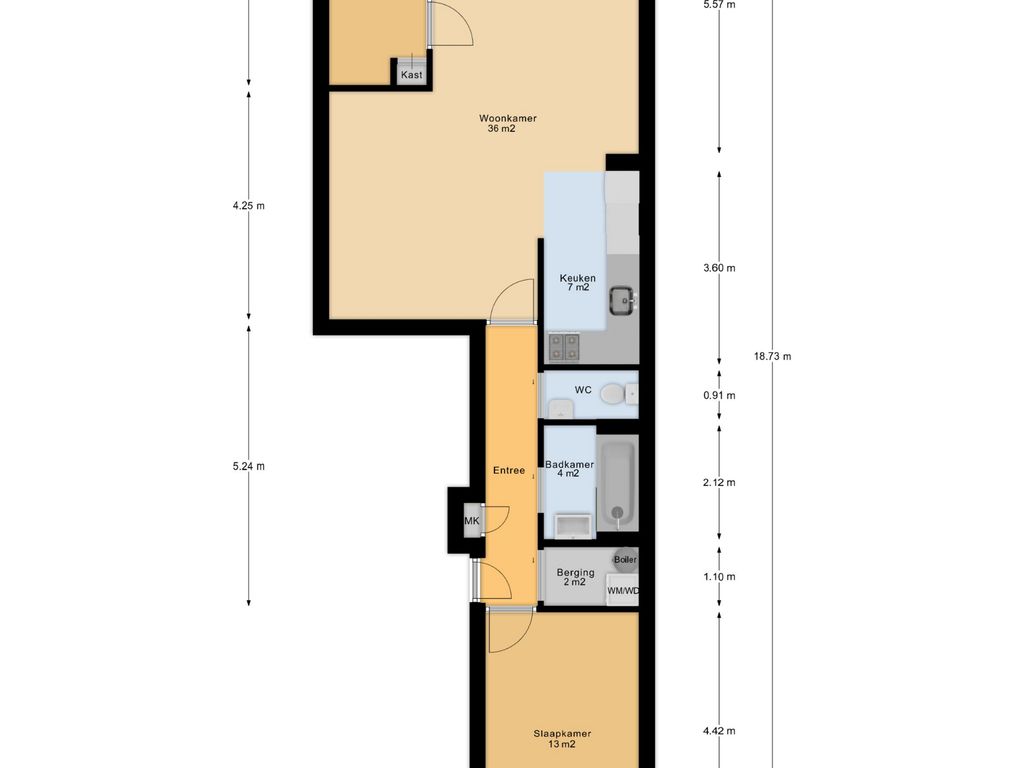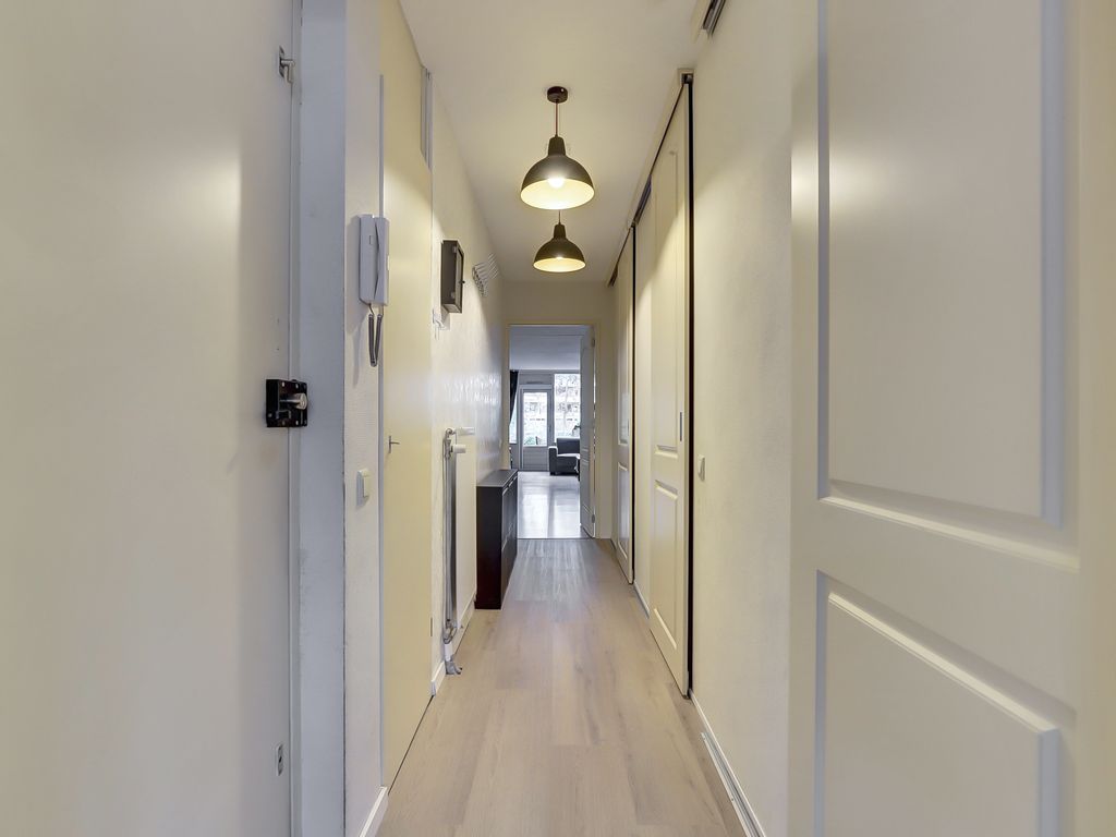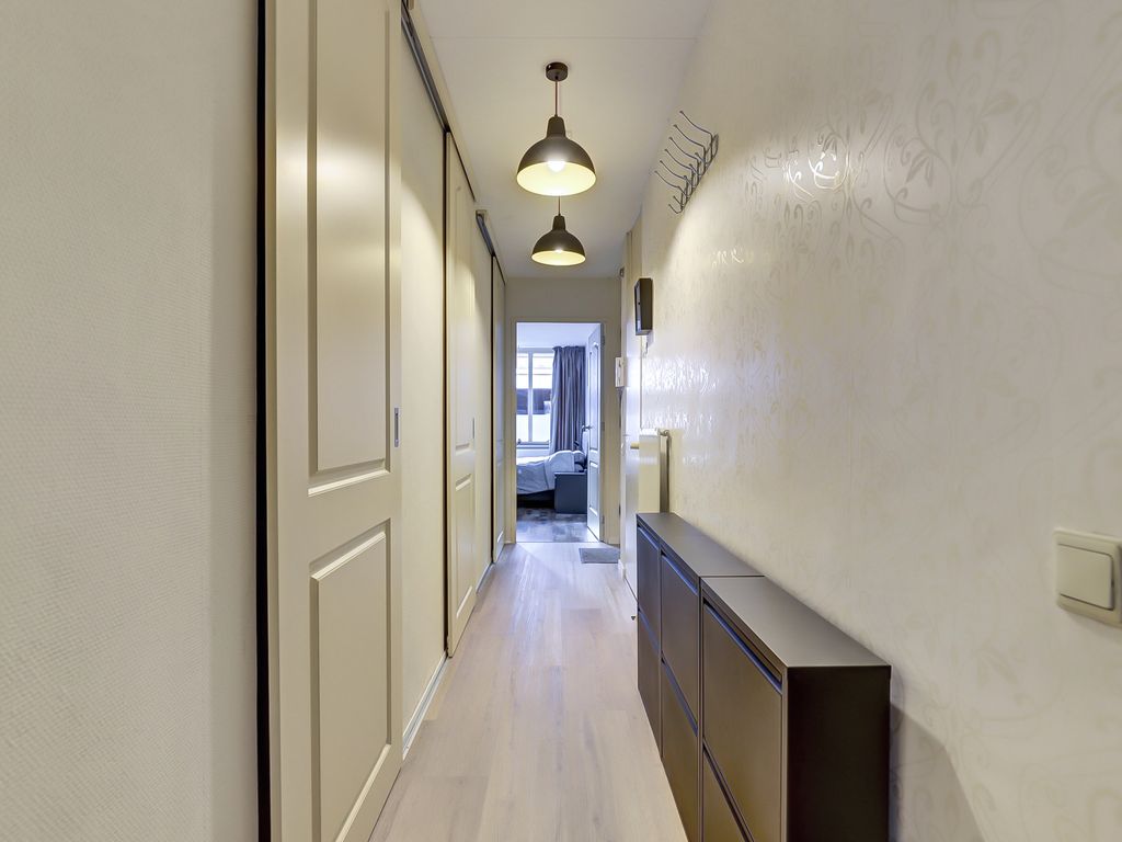 Je betreedt de woning via een gemeenschappelijke entree die toegang geeft tot een klein portiek met slechts twee woningen. Achter de eigen voordeur kom je in een hal die centraal staat in de woning en toegang biedt tot vrijwel alle vertrekken via handige schuifdeuren.