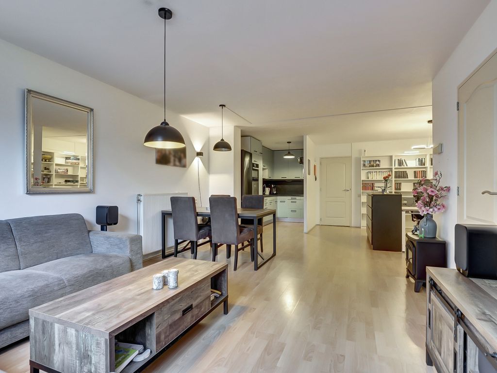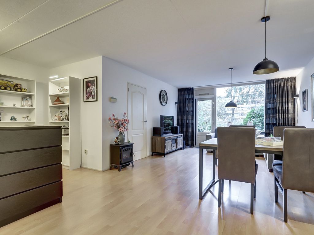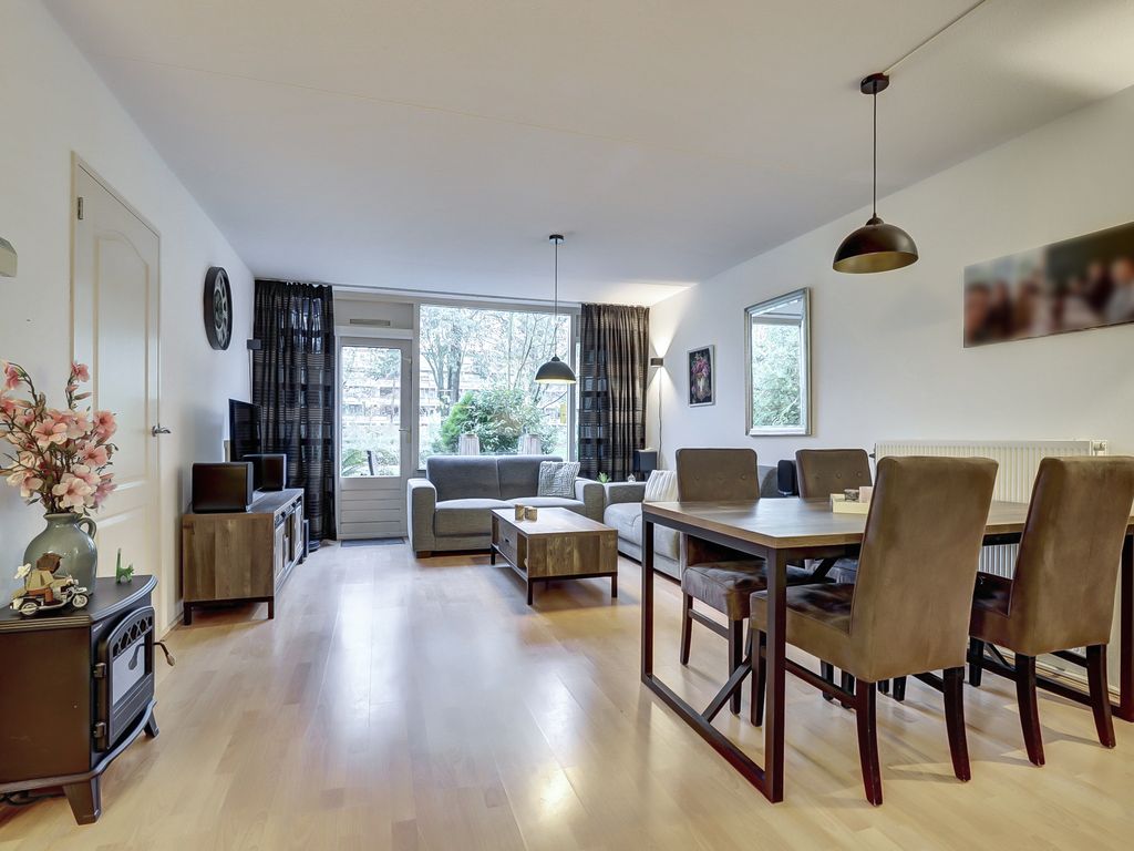 De woonkamer aan de tuinzijde vormt een bijzonder prettige leefruimte. Breed opgezet, licht en met een mooie verbinding naar buiten door de grote raampartijen over de volledige breedte. De zithoek is sfeervol ingericht en biedt volop ruimte voor een royale bankopstelling. De eethoek sluit soepel aan richting de keuken, waardoor de volledige ruimte open en uitnodigend aanvoelt.