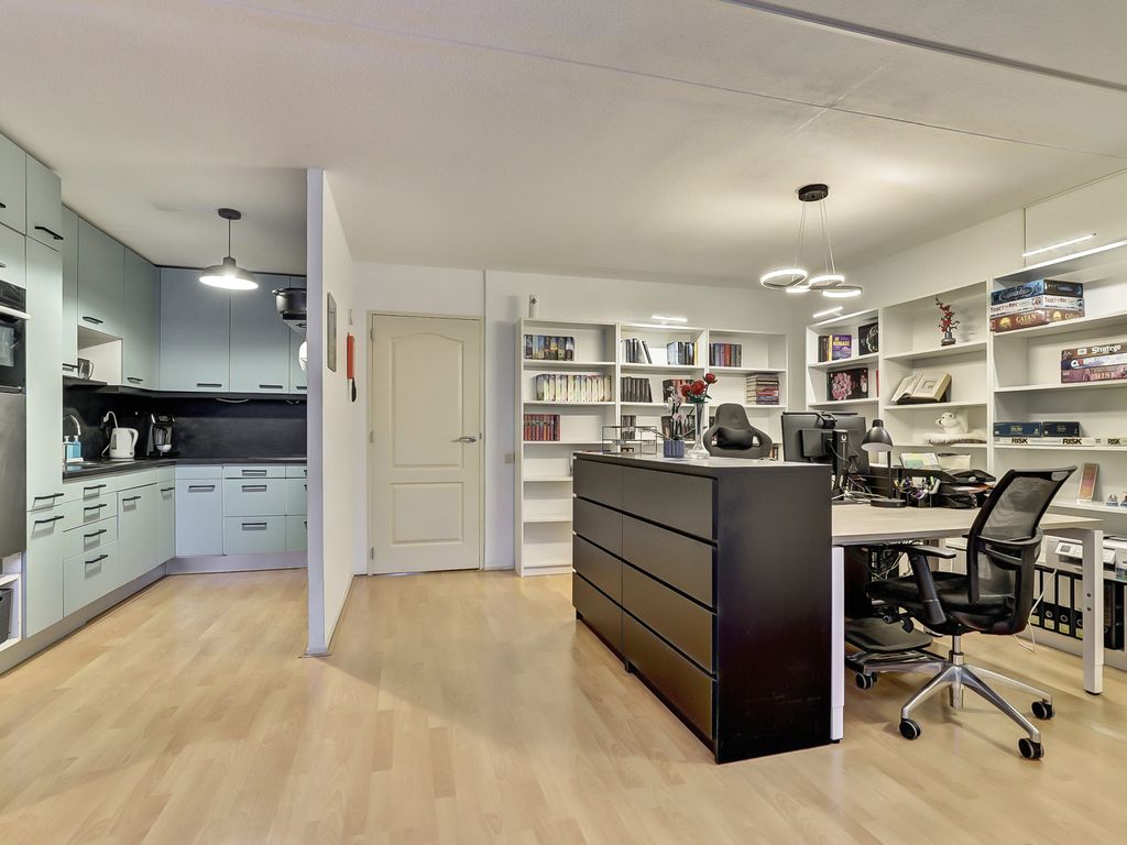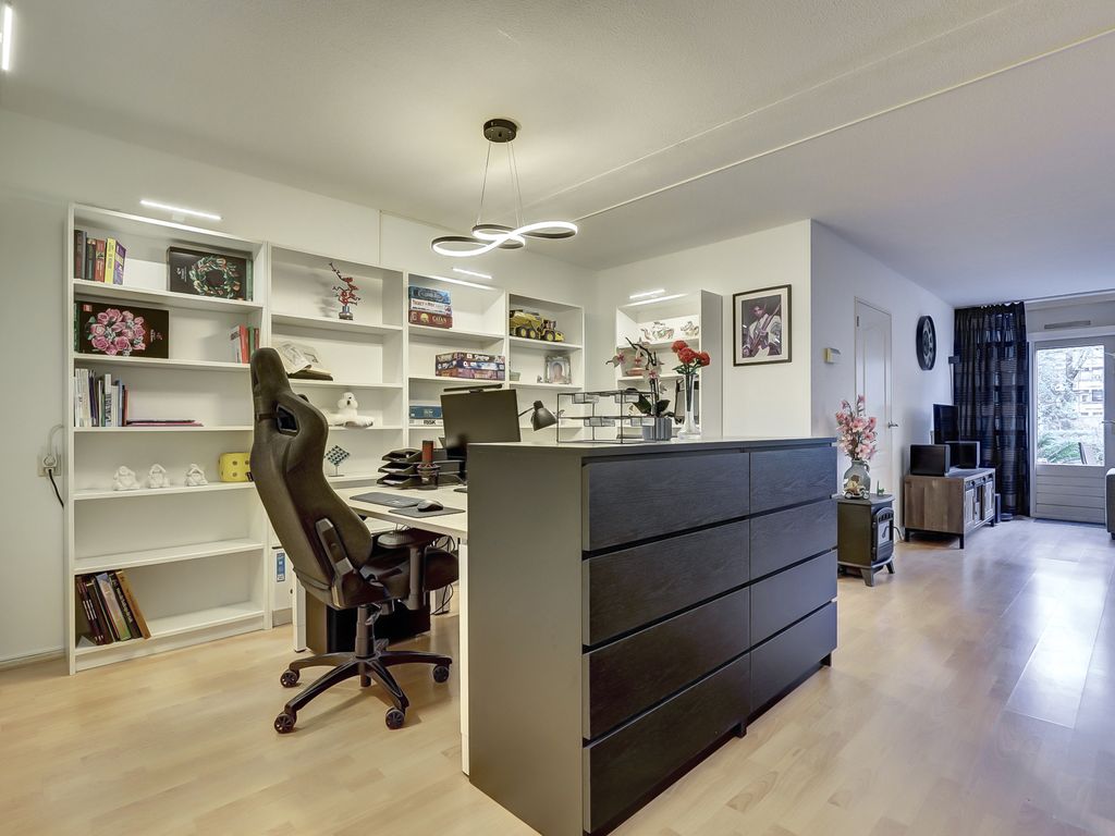 Aan de andere zijde van de woonkamer is momenteel een slim ingedeelde thuiswerkzone gecreëerd. Met ingebouwde wandkasten, een ruim bureau en royale werkruimte is dit een ideale plek voor iedereen die veel vanuit huis werkt of een eigen hobby- of studieruimte zoekt. Doordat de leefruimte zo royaal is opgezet, blijft het gevoel van openheid volledig behouden.