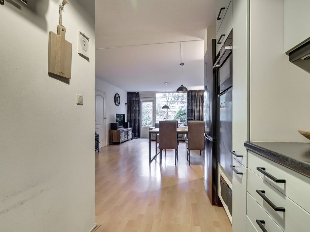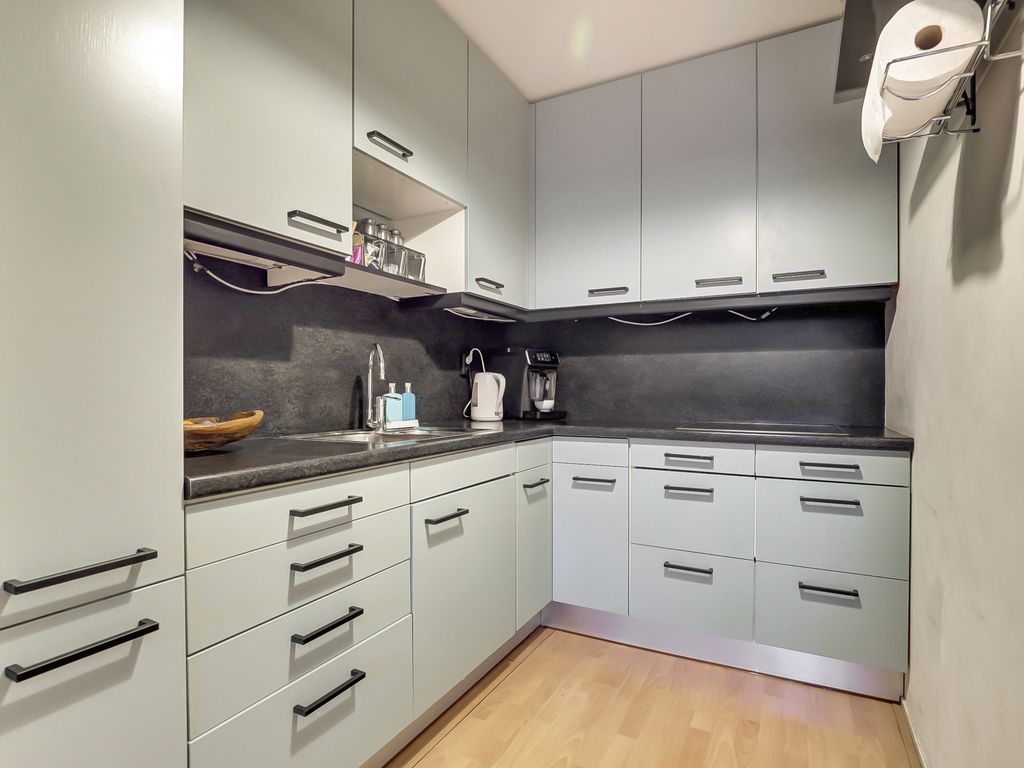 De keuken bevindt zich deels afgescheiden van de woonkamer en heeft een eigentijdse uitstraling. De hoekopstelling biedt bijzonder veel opbergruimte en een prettig werkblad. De moderne apparatuur, waaronder oven, kookplaat, vaatwasser en koelkast, is netjes geïntegreerd. Hier kun je comfortabel koken, terwijl je dankzij de open structuur toch in contact blijft met de rest van de leefruimte.