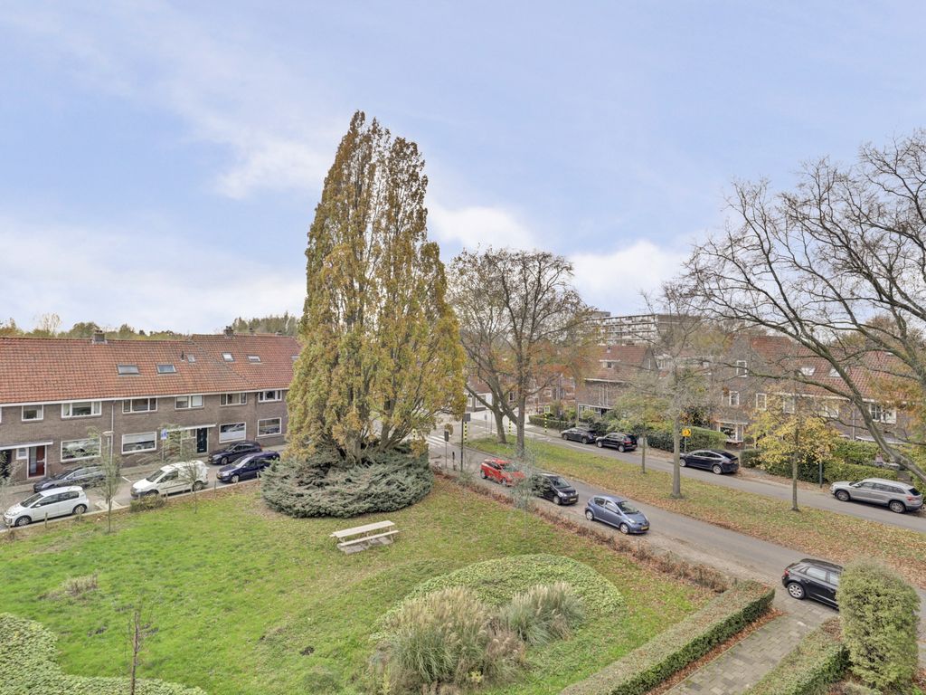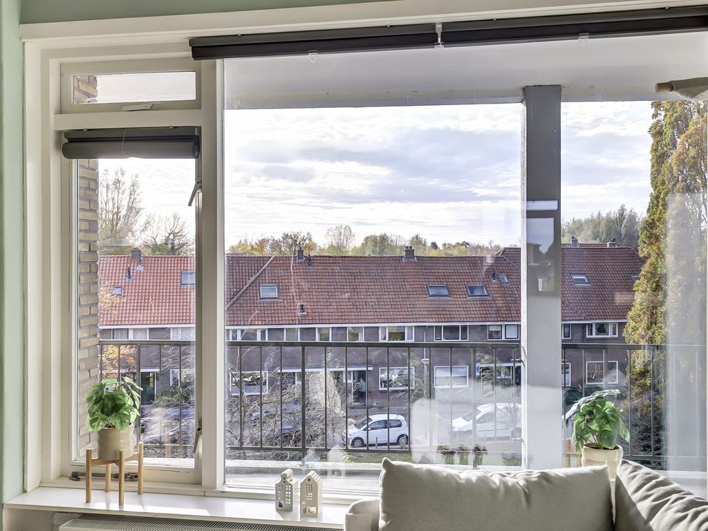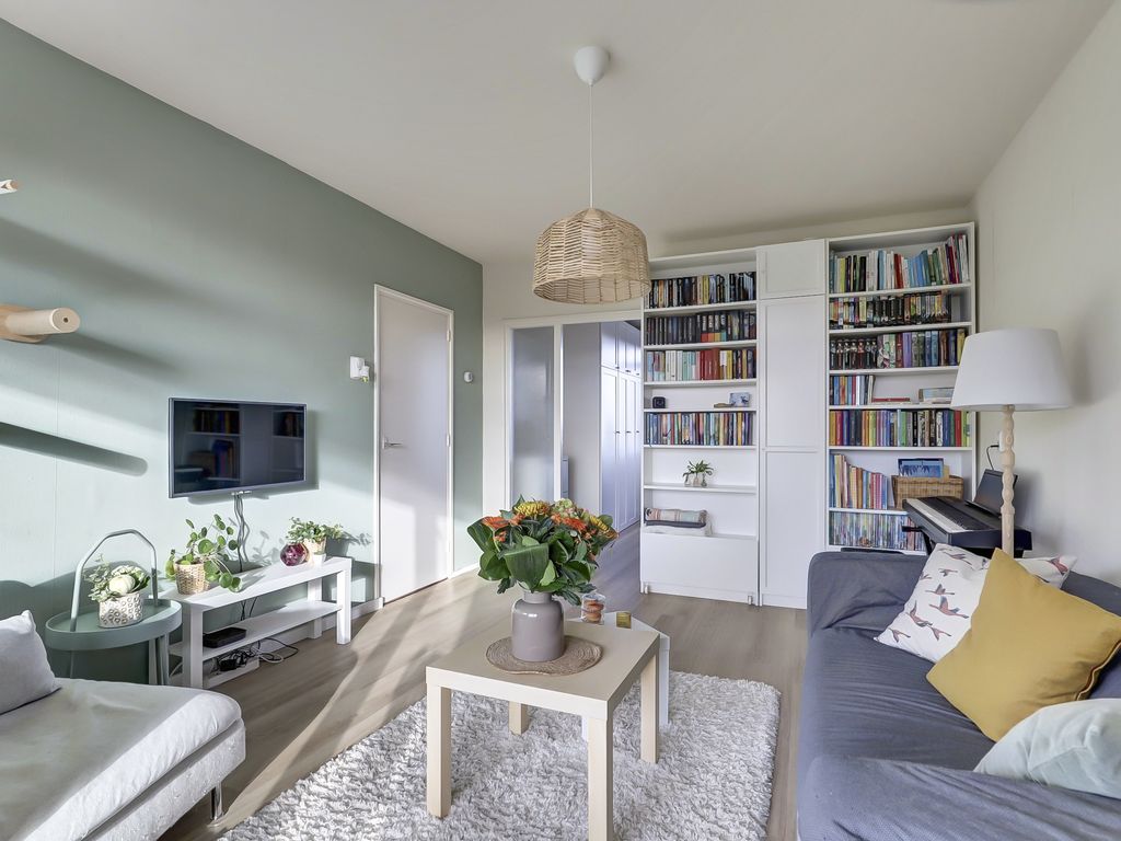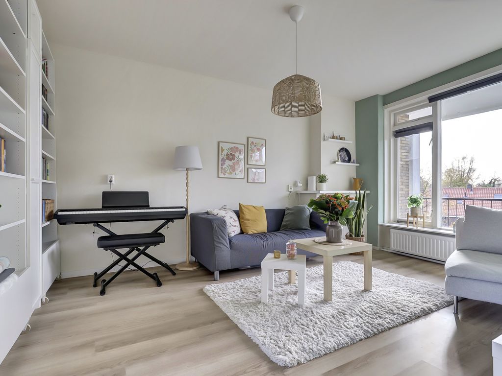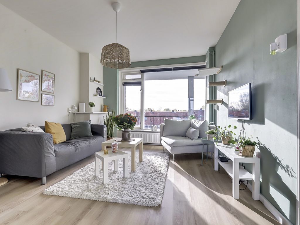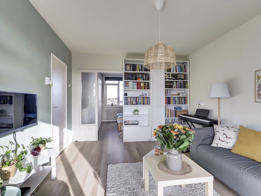 De woonkamer is een lichte en prettige ruimte van ca. 17 m² met grote raampartijen aan de voorzijde en vrij uitzicht over groenstroken en bomen. De neutrale laminaatvloer (doorlopend in het hele appartement) en lichte wanden zorgen voor een rustige uitstraling. Dankzij de positie op de derde verdieping geniet u hier de hele dag van licht en privacy.