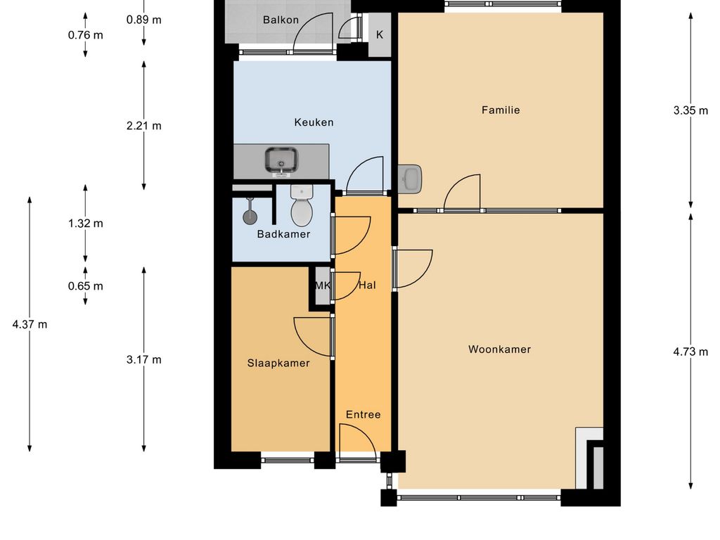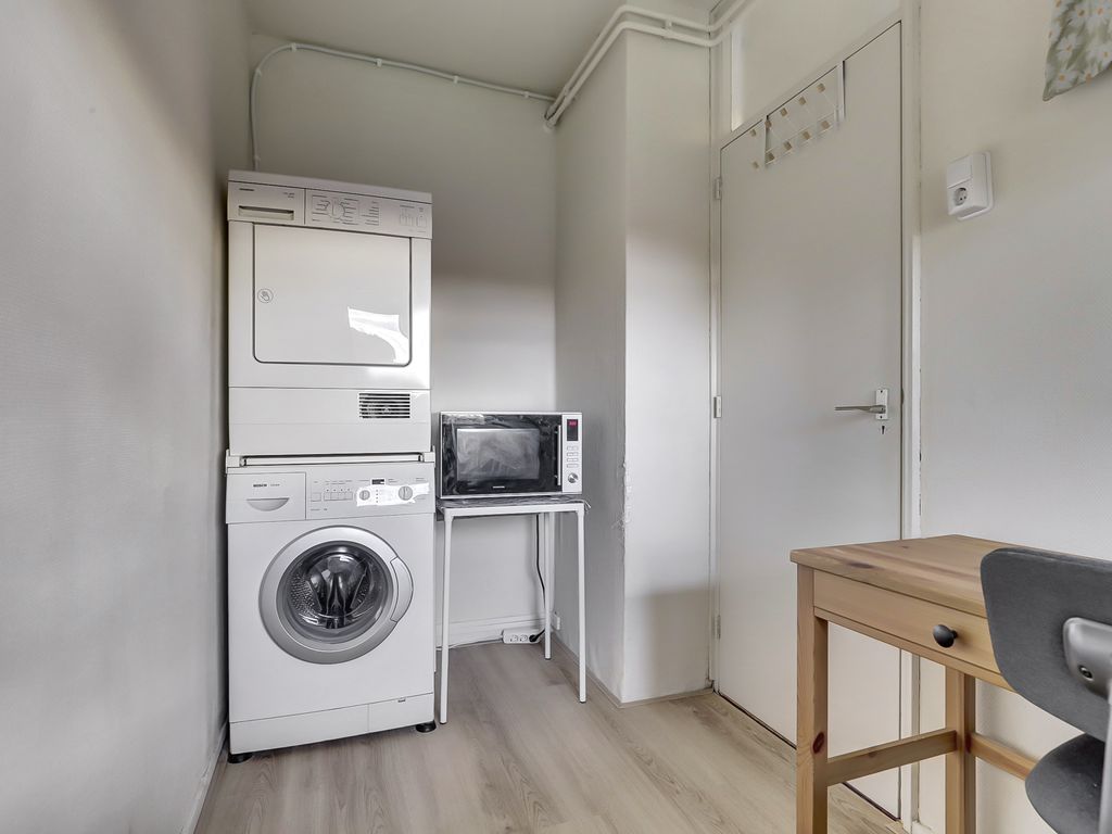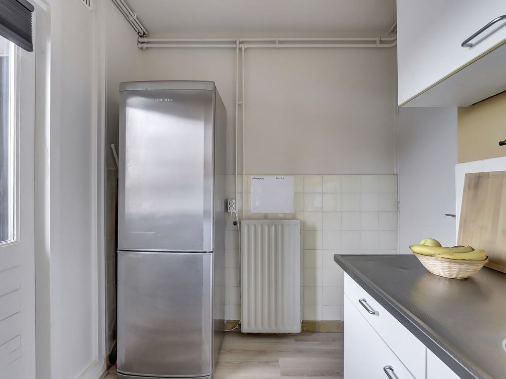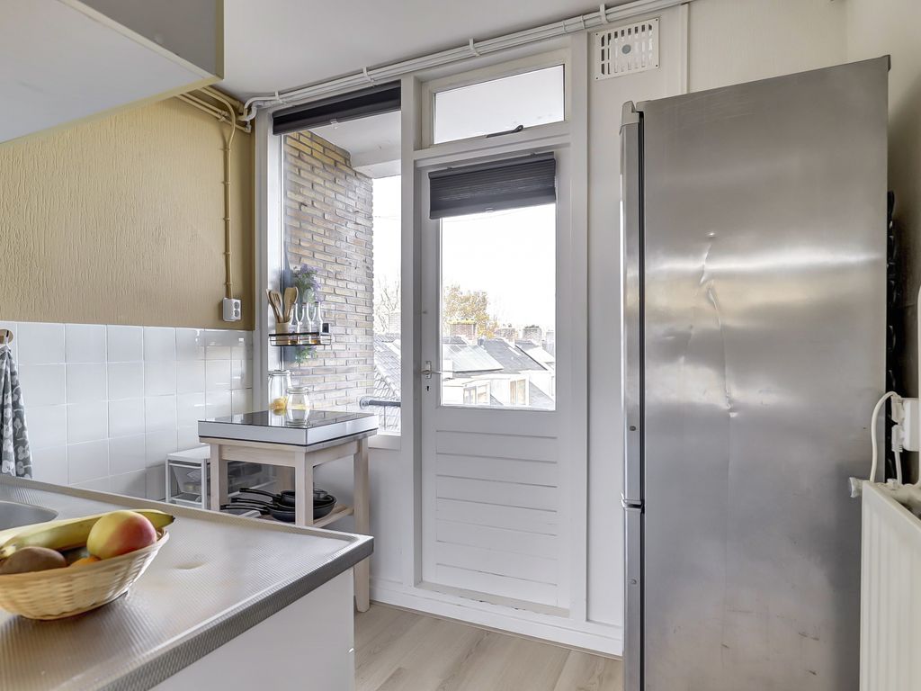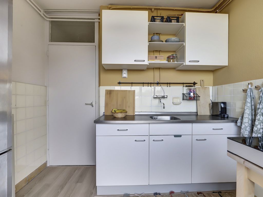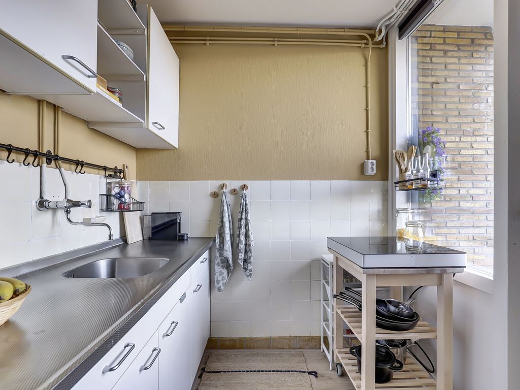 Aan de achterzijde bevindt zich de keuken (ca. 5,8 m²), voorzien van eenvoudig keukenblok, losse apparatuur, de cv-installatie en toegang tot het balkon. Dit balkon, met vaste balkonkast, ligt gunstig voor de middag- en avondzon en biedt zicht op de rustige achterzijde van het complex. De kunststof kozijnen aan deze zijde zorgen voor duurzame isolatie.