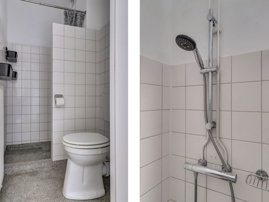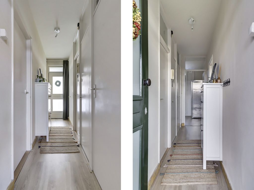 Via de galerij bereikt u de voordeur. In de hal vindt u de meterkast (elektra vernieuwd), toegang tot de doucheruimte met toilet en de doorgang naar de overige vertrekken.