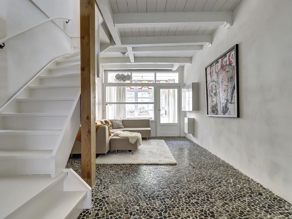Bij binnenkomst valt direct het authentieke karakter van de woning op. In de ruime entree (ca. 8 m²) met vernieuwde meterkast en dubbel glas, zijn fraaie details zichtbaar zoals het glas-in-lood bovenlicht en balkenplafond. De gezellige woonkamer van circa 38 m² heeft een stoere uitstraling dankzij het natuurstenen mozaïekvloer met vloerverwarming (aangelegd in 2005) en het balkenplafond. De trapopgang naar de verdieping is mooi in de ruimte verwerkt.