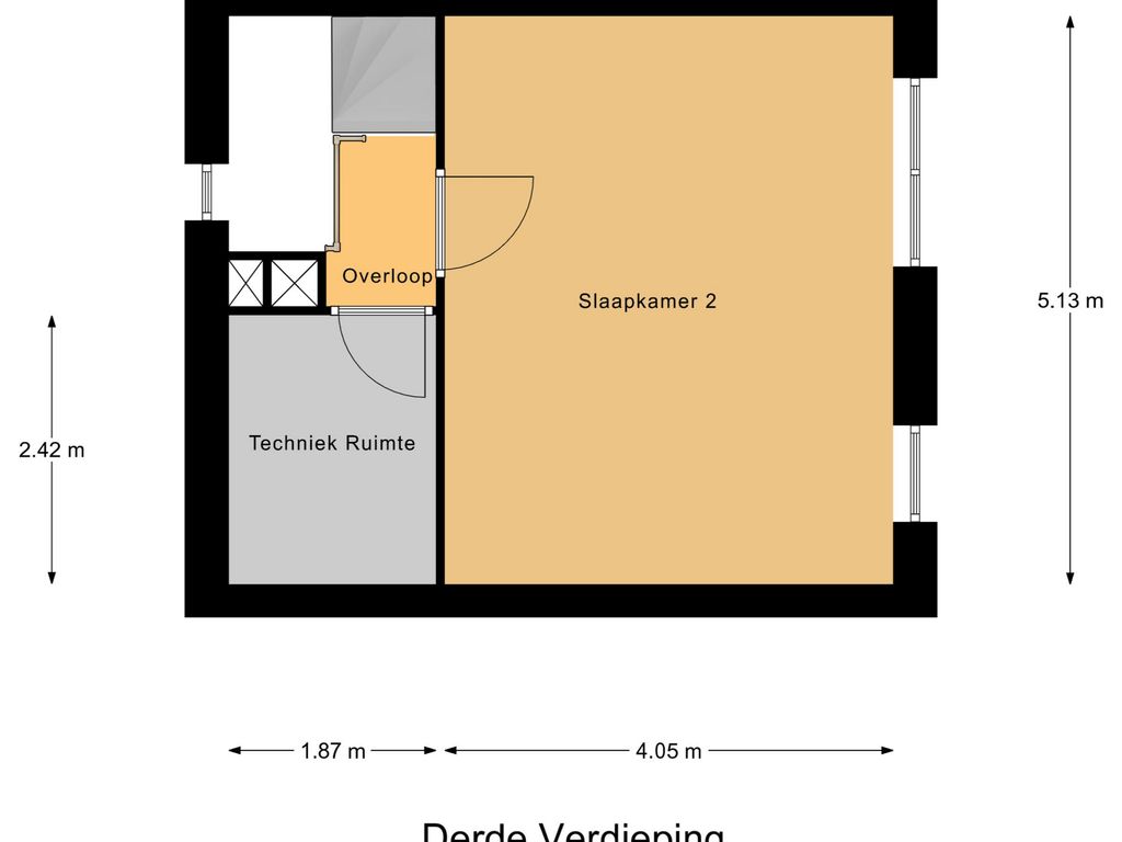 De bovenste (3e) verdieping is ingericht met een ruime slaapkamer en een aparte technische ruimte met aansluitingen voor wasmachine en droger, hier is verder aanwezig de warmtepompinstallatie, de boiler en het WTW-systeem. Dankzij de ligging onder het dak en de brede raampartijen is deze verdieping uitermate geschikt als luxe ouderslaapkamer, atelier, studio of rustige thuiswerkplek. De ruimte is prettig licht en biedt veel privacy.