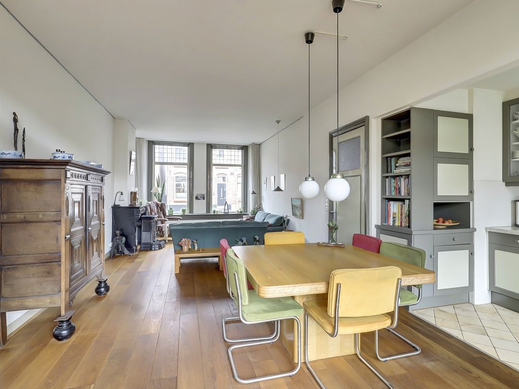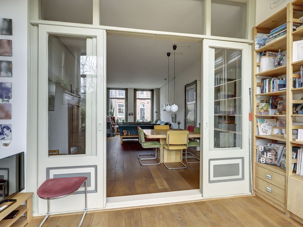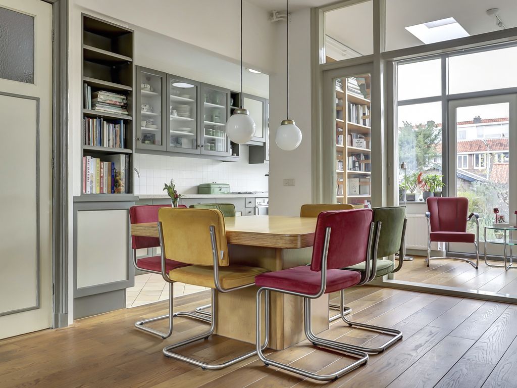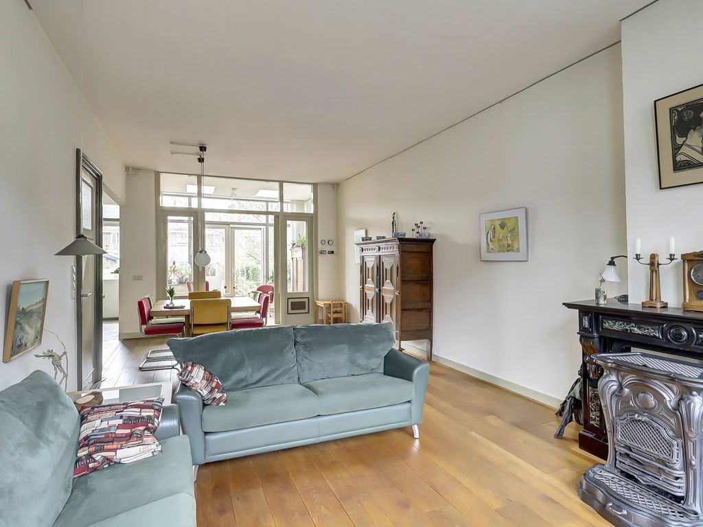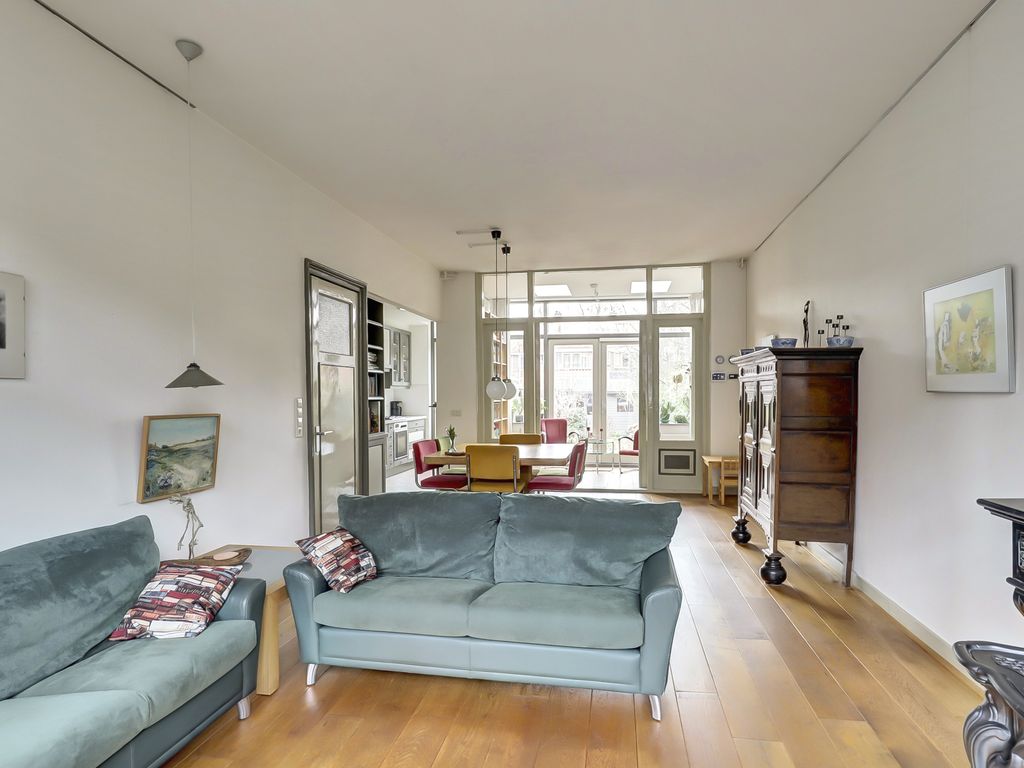 De living biedt volop ruimte voor een comfortabele zithoek aan de voorzijde en een royale eethoek met serre aan de tuinzijde. De achterkamer is extra licht dankzij de lichtkoepels en de openslaande deuren die direct toegang geven tot de tuin, waardoor binnen en buiten mooi in elkaar overlopen.