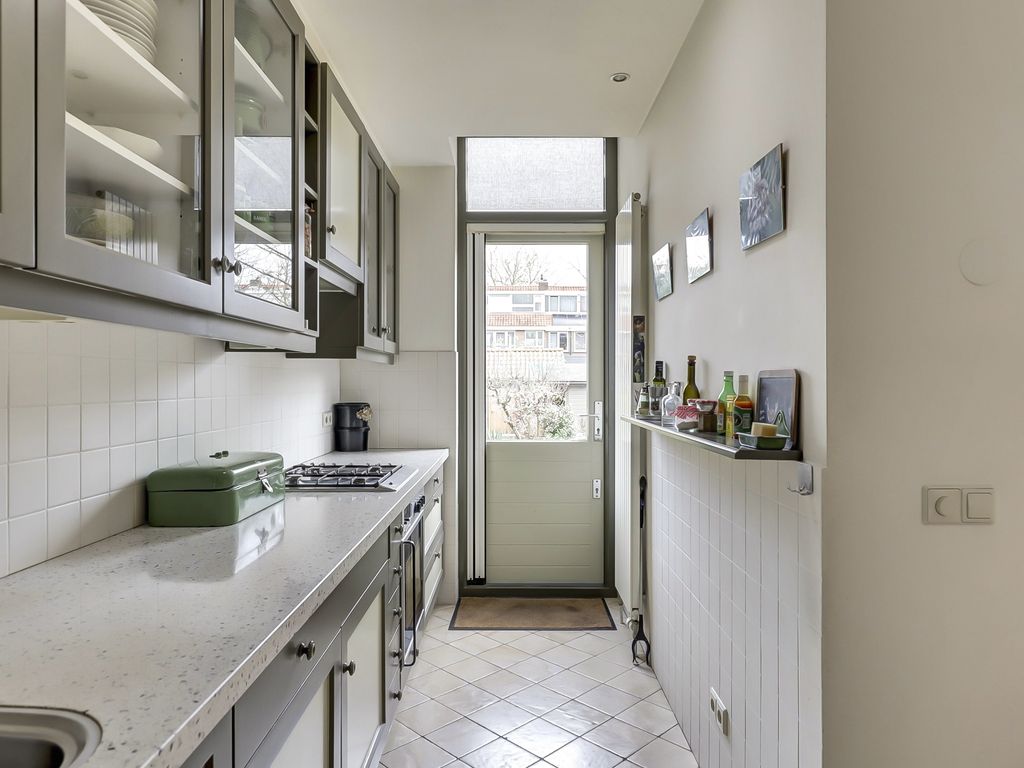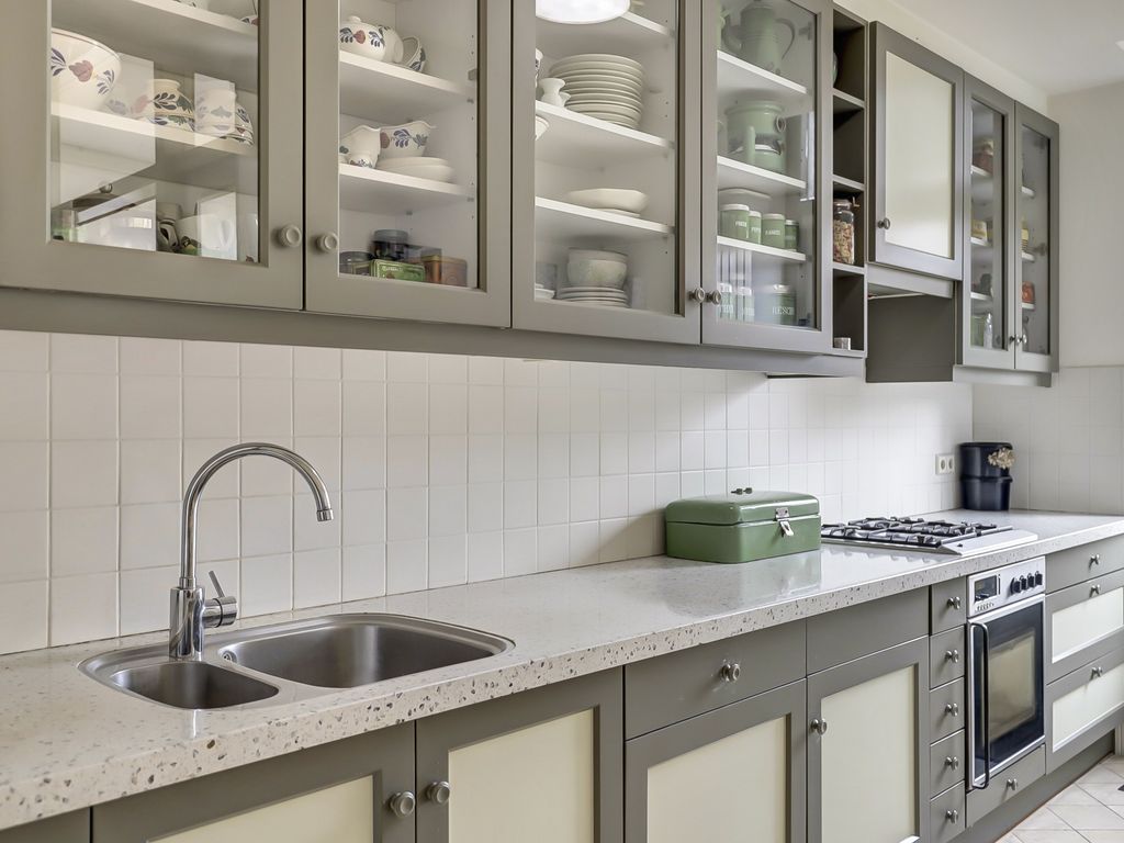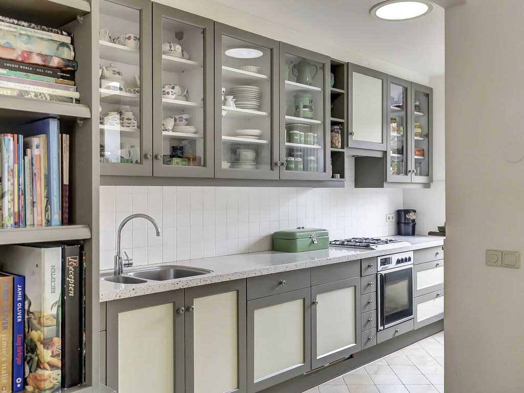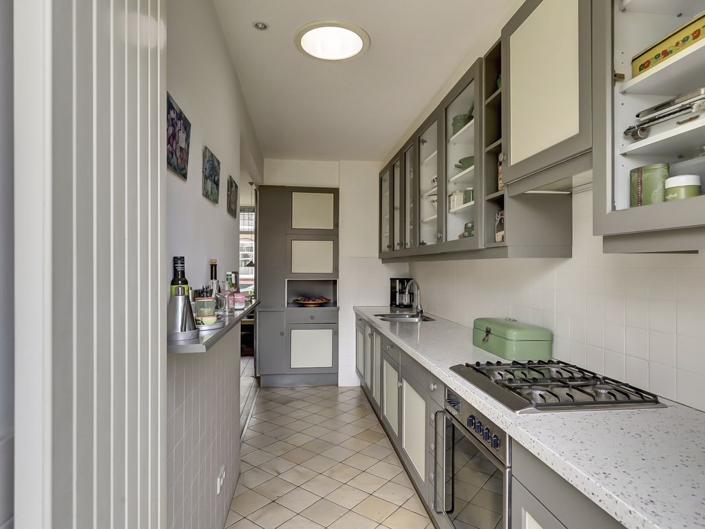 Aan de achterzijde bevindt zich de keuken, uitgevoerd in een nette en functionele opstelling met veel kastruimte en diverse inbouwapparatuur, waaronder een oven, gasfornuis, afzuigkap en dubbele spoelbak. Vanuit de keuken is er direct toegang tot de achtertuin, wat het geheel praktisch en prettig in gebruik maakt. De keuken is voorzien van een grote Solatube wat zorgt voor fijne lichtinval.