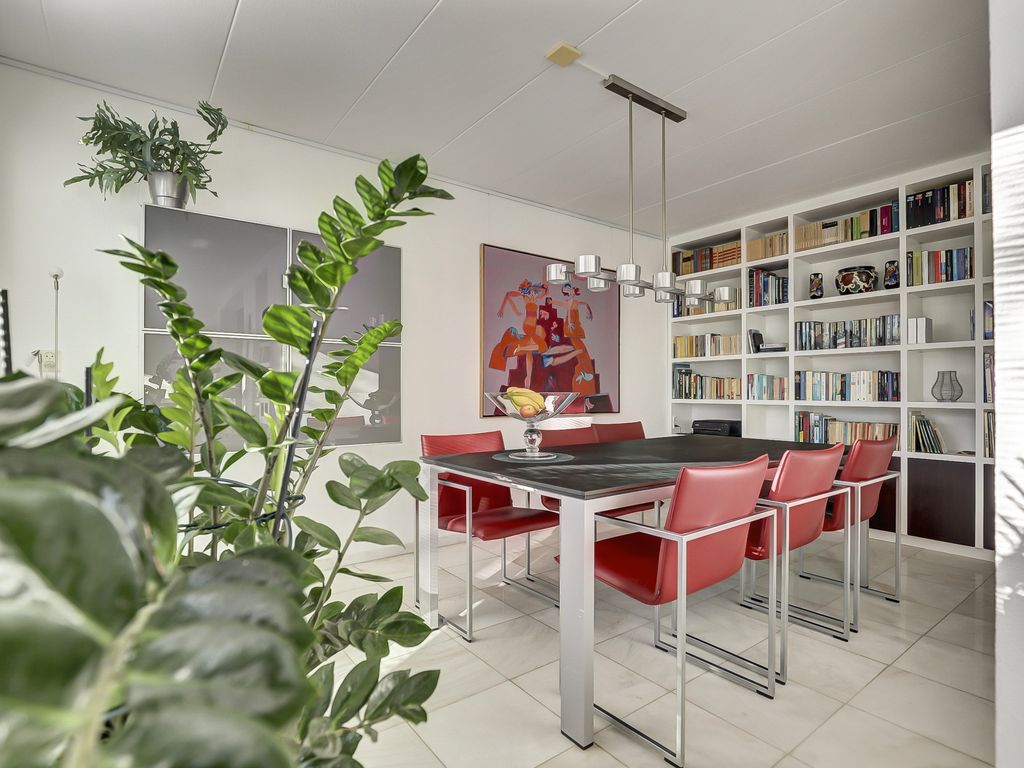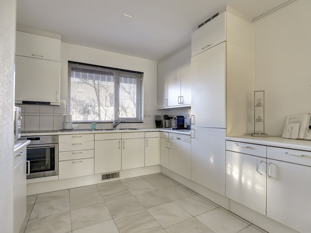 Aansluitend bevindt zich de eethoek met directe toegang tot de tuin, waardoor binnen en buiten mooi in elkaar overlopen. De open keuken is aan de voorzijde van de woning gesitueerd en uitgevoerd in een lichte kleurstelling. De Siematic keuken is praktisch ingericht en voorzien van diverse, vernieuwde inbouwapparatuur, waaronder een oven, elektrische kookplaat, afzuigkap, dubbele spoelbak, vaatwasser, koelkast en vriezer. Daarnaast is er volop werk- en bergruimte aanwezig. De gehele begane grond is afgewerkt met een lichte tegelvloer die bijdraagt aan de moderne uitstraling.