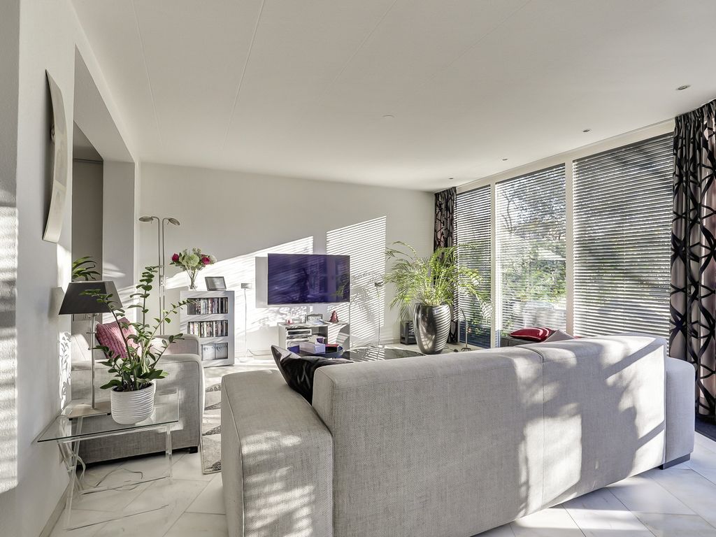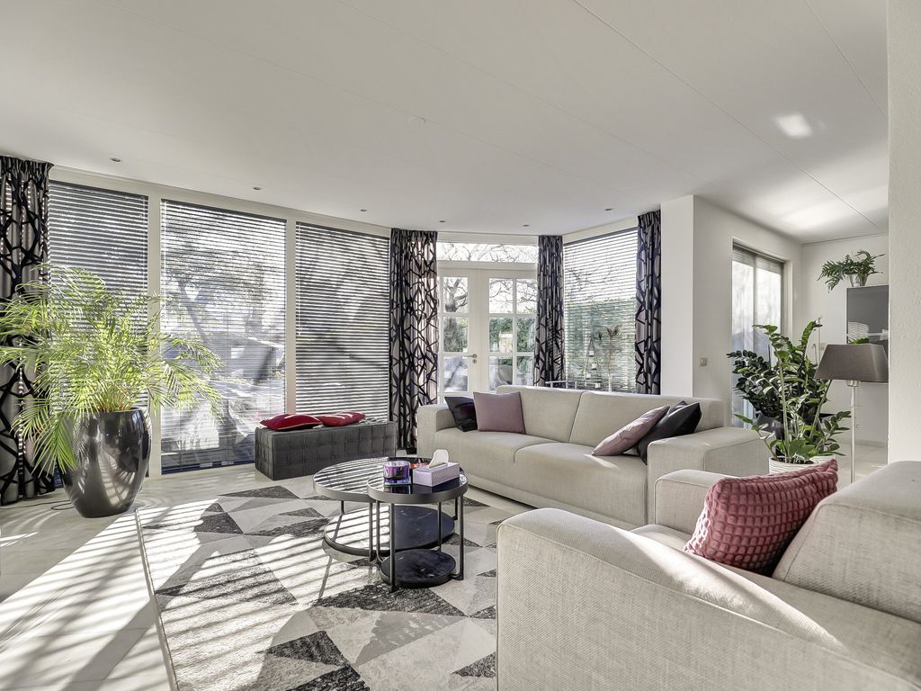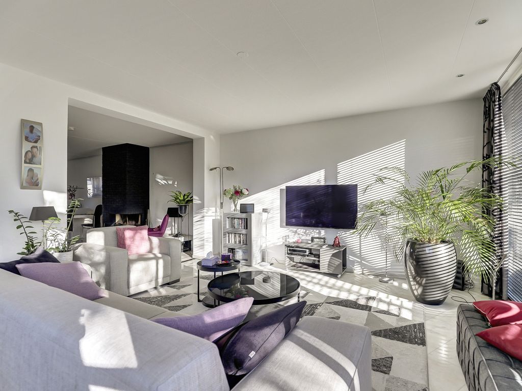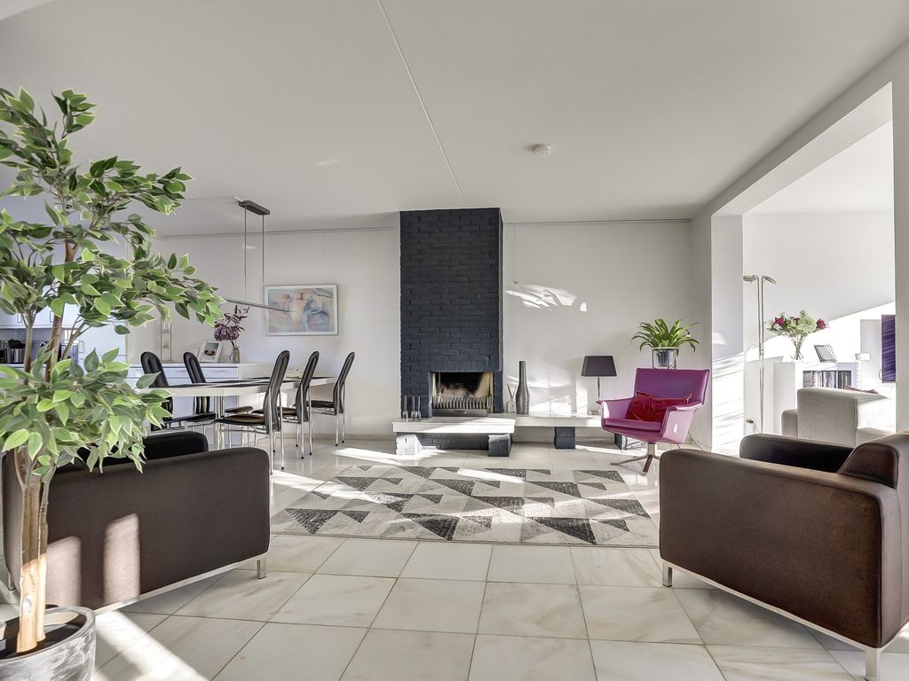 Via de entree komt u binnen in de hal met meterkast, toiletruimte en toegang tot de inpandige garage. Vanuit de hal bereikt u de royale woonkamer van circa 65 m², die direct opvalt door de ruimte, de lichtinval en de open indeling. Er zijn meerdere zitgedeeltes, waaronder een zithoek rondom de sfeervolle open haard en een zitplek met uitzicht op de tuin. Grote raampartijen zorgen voor een aangename, natuurlijke lichtinval.