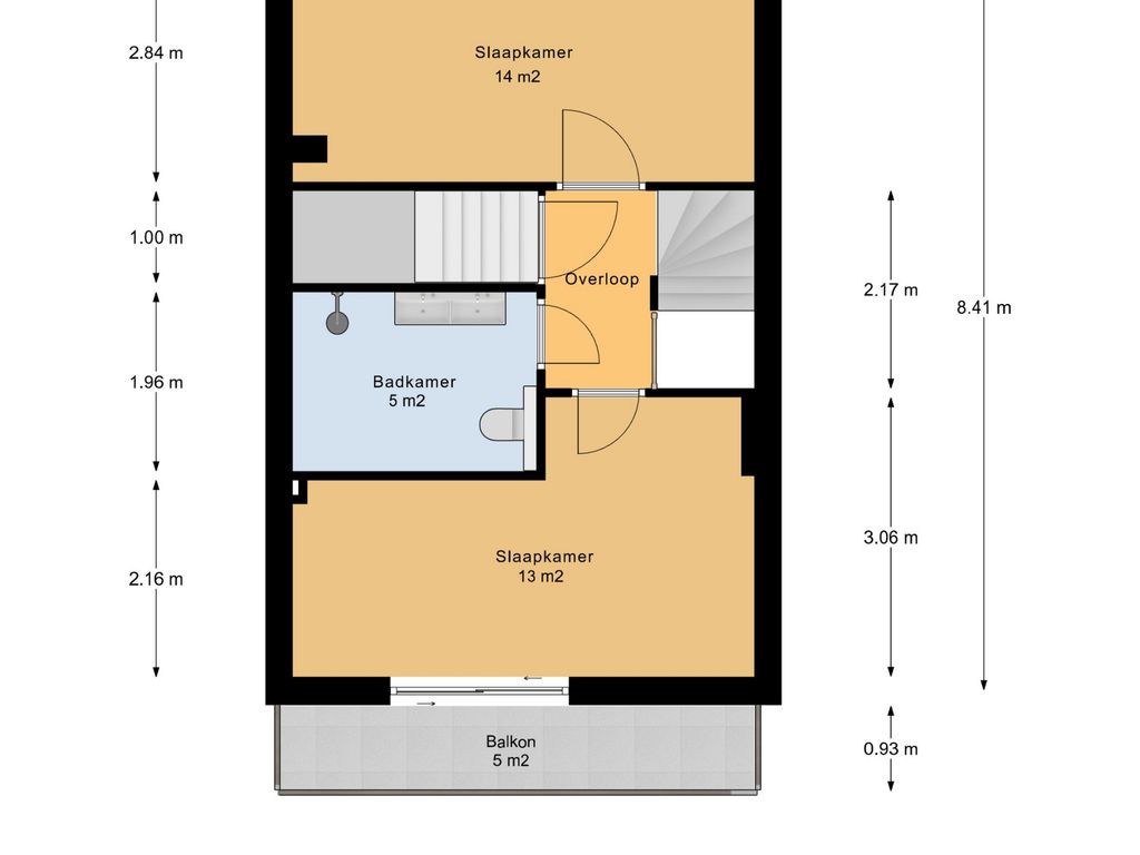 Op de eerste verdieping bevinden zich twee ruime slaapkamers van circa 14 m² en 13 m². De slaapkamer aan de voorzijde beschikt over toegang tot het balkon, een fijne plek om even buiten te zitten. Beide kamers zijn licht en praktisch in te richten.
