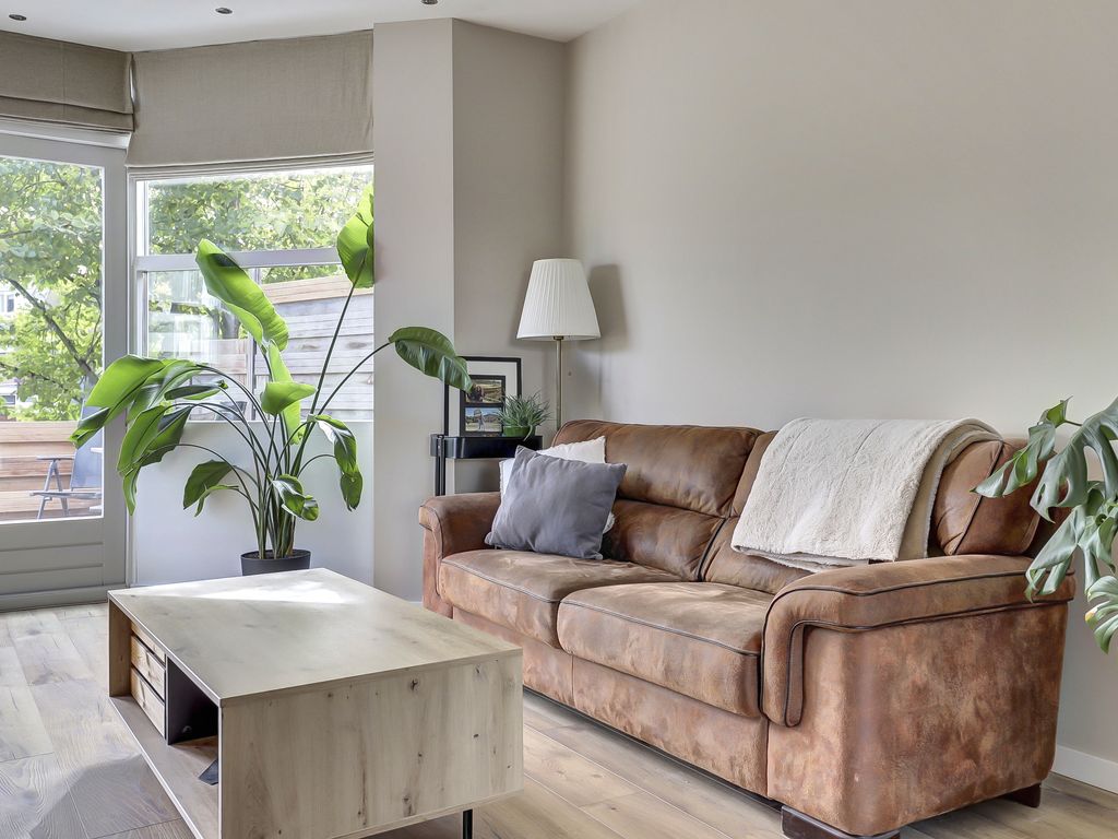 Via de hal met toilet, voorzien van hangcloset en fontein, stap je binnen in de lichte woonkamer met een warme eikenhouten vloer in brede planken en strak gestuukte wanden. De achtergevel is voorzien van een erker met triple glas en openslaande deuren naar het terras met uitzicht over de groene tuin. Het plafond in de woonkamer is strak afgewerkt met inbouwspots, wat zorgt voor een moderne, sfeervolle uitstraling.