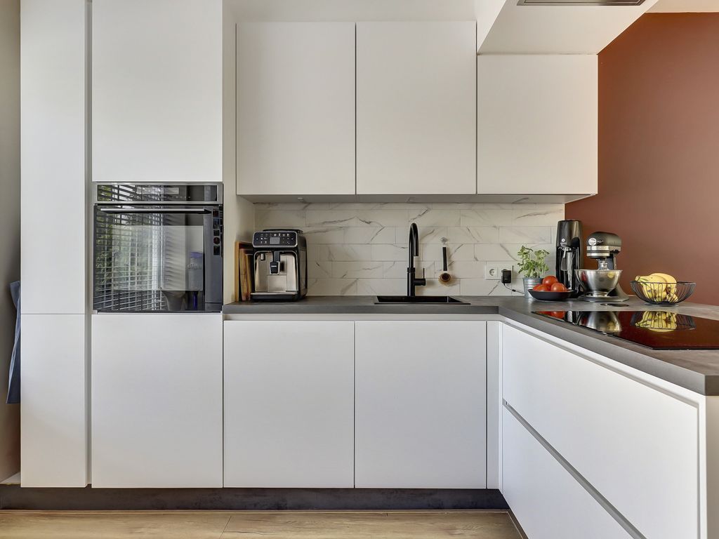 De keuken is in 2024 vernieuwd en modern en luxe uitgevoerd met greeploze witte fronten, een donker composiet werkblad en een marmerlook achterwand. De keuken is voorzien van hoogwaardige inbouwapparatuur, waaronder een inductiekookplaat, een afzuigkap met directe afvoer naar buiten, een combimagnetron, Quooker met grote boiler, vaatwasser en koel-vriescombinatie.