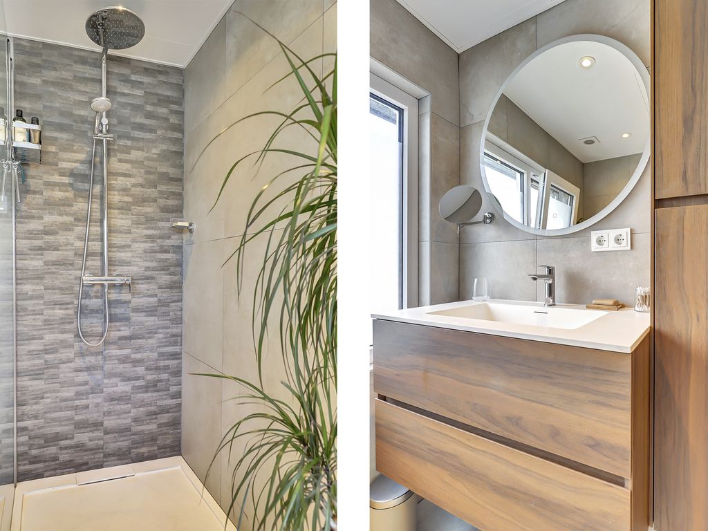 De moderne badkamer (vernieuwd in 2024) is geheel betegeld met grote grijsbeige tegels en voorzien van een inloopdouche met glazen wand, een hangcloset, een stijlvol houten wastafelmeubel, elektrische verwarming én comfortabele vloerverwarming. Het grote raam biedt daglicht en ventilatie, terwijl de strakke plafondspots zorgen voor een moderne afwerking.