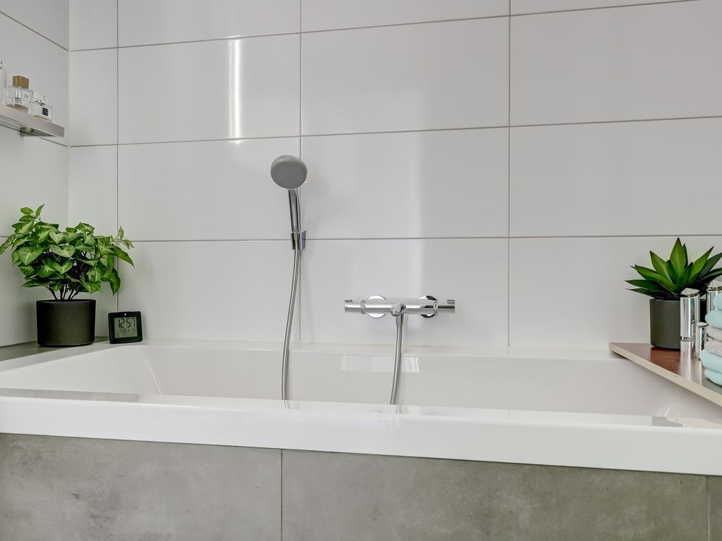 De badkamer (2015) is luxe uitgevoerd en voorzien van een kunststof ligbad, een dubbele wastafel met meubel, verwarmde spiegelkast, luxe radiator en een separate douche met glazen deuren.